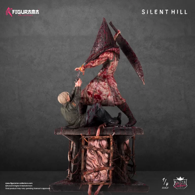 The Figurama Team decided to throw it back to the original Silent Hill 2 with a ¼ scale statue just as dynamic and adaptable as the gamers who braved the dark recesses of James’ journey. This depiction captures the tense moment in which Red Pyramid Thing swings his Great Knife at a gun-wielding James Sunderland atop a unique triangular base. The air canister, notorious Louise box, and Dog Key sit at the foot of the action in reference to multiple impactful moments from the game. Bright red blood drips from James’ humanoid enemy to the gruesome vision of tangled monsters and rusted contraptions below. With options to equip Red Pyramid Thing with the Great Spear and opt for a Solo piece by substituting James Sunderland for the ominous television swappable, this piece is a surprise at every turn!