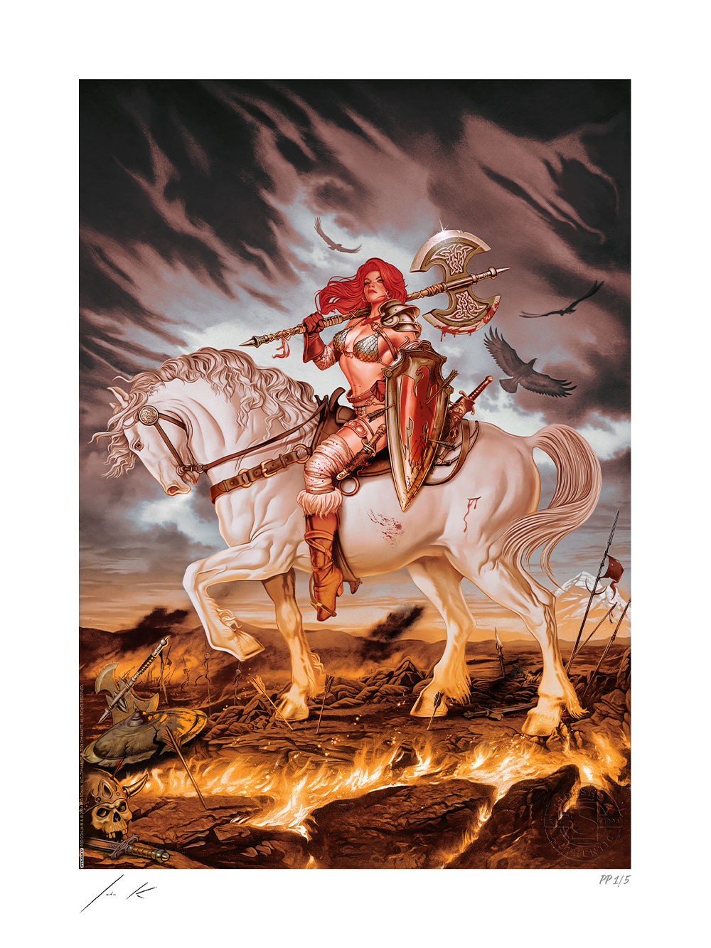 She offers no mercy! Wearing her classic metal armor and leather accessories, Red Sonja sits astride a muscular white war horse in this victorious portrait. She brandishes a bloodied axe and shield as she surveys this razed ground, satisfied with the smoke dancing in the sky, proud of the flames blazing through the earth. If there is a single enemy left alive upon this corpse-littered land, Red Sonja shall cut them down — for there are always consequences to defying a destroyer.