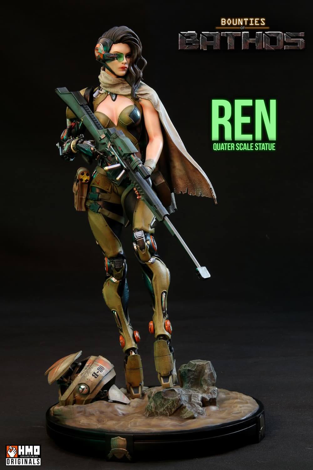 A ruthless desert Hunter, Incredibly strong with enhanced M.E.C.H. Armor. HMO is proud to present the first character in the line of Bounties of Bathos. “The White Witch” REN. Sculpted in glorious details with the latest in manufacturing techniques. Ren is depicted in the final pose after sniping down drones from the sky that would have revealed her location. Armed with her rifle, Ren is donning her signature armour that was crafted by the legendary Dr. Zero. Her Bio-mechanical suit enhances all her senses and boosts her speed and power, enabling her to be one of the deadliest hunters on Bathos.