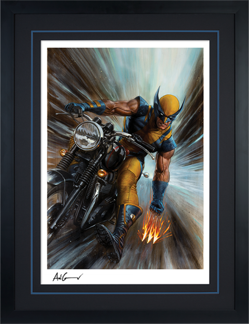You can’t keep a good mutant down! The Return of Wolverine Fine Art Print puts a resurrected Logan back in the saddle as he races into action on his motorcycle. Artist Adi Granov captures the speed and intensity of Wolverine’s ride as his Adamantium claws kick up sparks on the ground beside him. Dressed in his blue and yellow costume, this mighty Marvel mutant is ready to do what he does best, no matter the foe he faces.