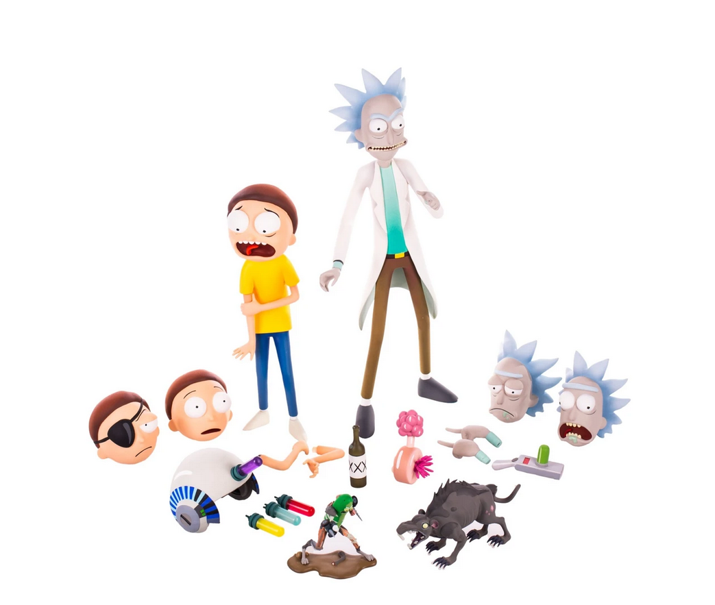 Rick & Morty, the portal popping pair, are now HUGE figures to add to your wubbalubbadubdub collection! Each features neck, hand, and ankle articulation, interchangeable heads and hands, accessories, and all with the smell of adventure!