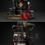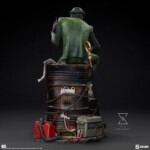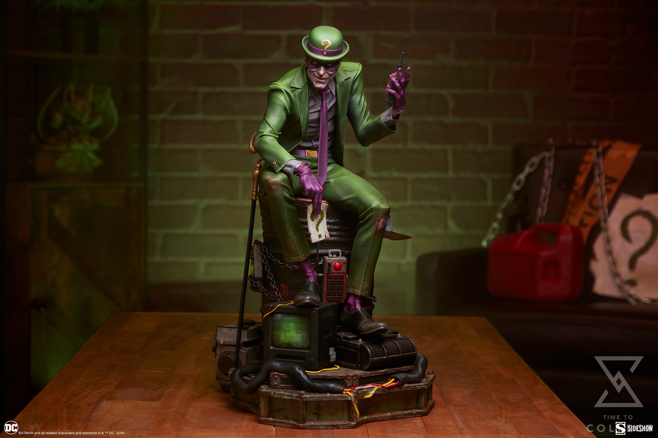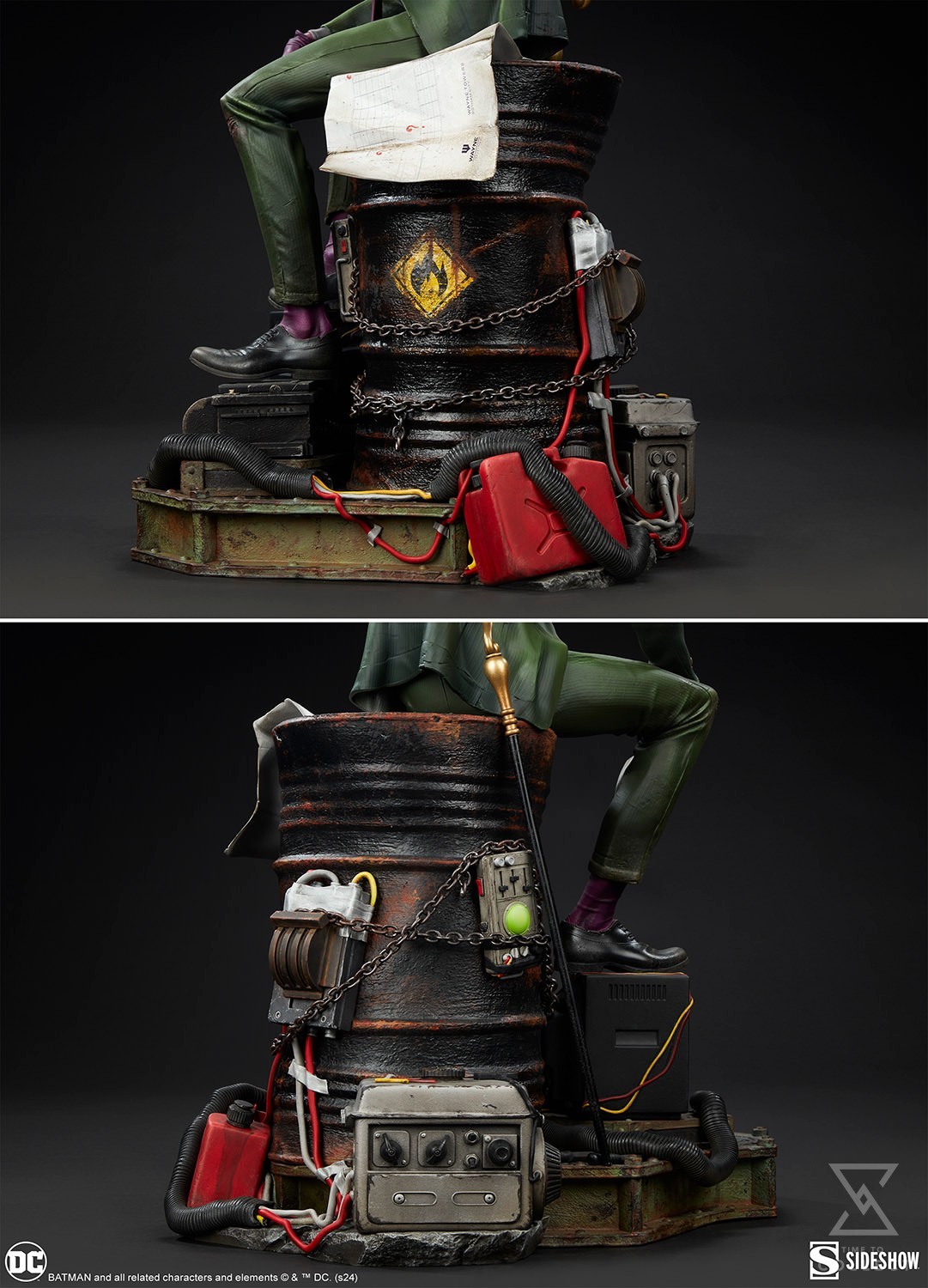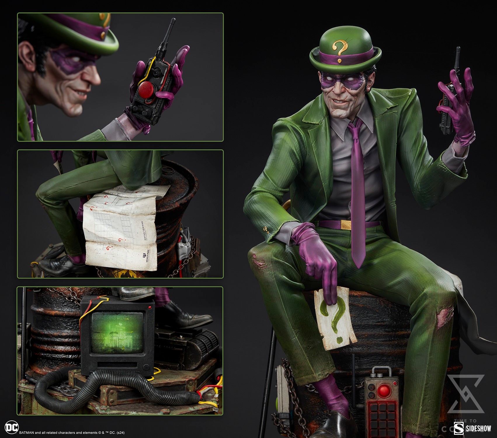The Riddler Premium Format Figure measures 19.5” tall, 11.8” wide, and 14.3” deep as an egotistical Edward Nygma taunts Batman from atop a lacquered black barrel. Sinewy and sociopathic, the master strategist holds a good old fashioned paper riddle in one hand and a detonator in the other. The Riddler has purposefully put himself front and center in this rusted warehouse. Clues and threats — including Wayne Tower security footage and blueprints, an electronic keypad, a question mark cane, generators, gasoline drums, chains, and wires — are piled high. Now Riddler’s got Batman right where he can see him put together all the puzzle pieces … or die trying.