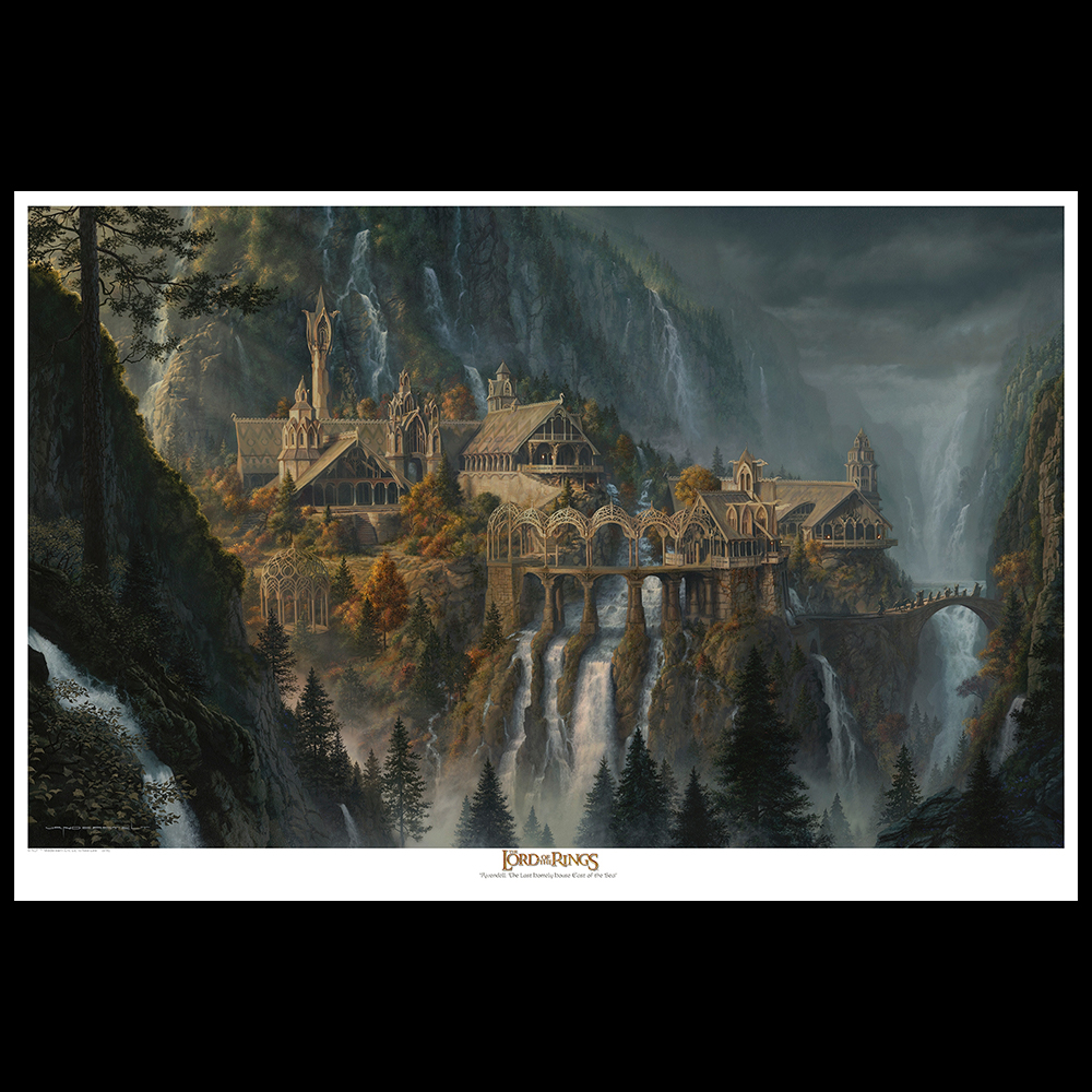 Imladris, the Last Homely House…the Elven settlement was known by many names, though its paths were shrouded in secrecy and enchantment. Perched among waterfalls in a hidden valley in the foothills of the Misty Mountains, Elrond’s home provided a safe haven for Thorin’s company during the quest for Erebor and Frodo’s party when they sought refuge from Sauron’s wraiths. It was at Elrond’s council in Rivendell that the Fellowship of the Ring was born and the quest to destroy the One began. Even beyond the end of the Third Age, when the Rings of Power were no more and Elrond had passed over the Sea, Rivendell remained, at least for a time, in the keeping of Elrond’s sons Elladan and Elrohir. Rivendell – The Lord of the Rings giclee print joins a range of gorgeous art prints and lithographs by Jerry Vanderstelt.