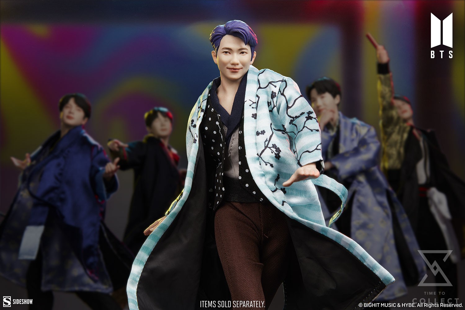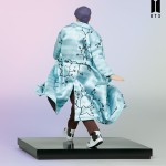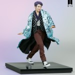 The RM Deluxe Statue measures 9.2” tall and 8.4” wide and features an intricate mixed media costume application. The carefully tailored outfit includes wire for posing the robe fabric to capture the dynamic movement of RM’s stage presence. Complete with sculpted details like earrings and black and white sneakers, the energetic figure stands on a black stage base to match the other members of the collection.