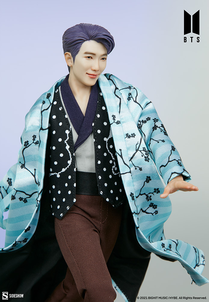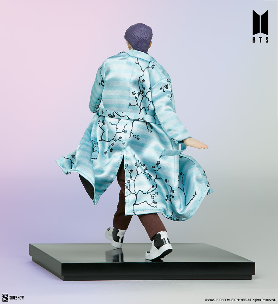 The RM Deluxe Statue measures 9.2” tall and 8.4” wide and features an intricate mixed media costume application. The carefully tailored outfit includes wire for posing the robe fabric to capture the dynamic movement of RM’s stage presence. Complete with sculpted details like earrings and black and white sneakers, the energetic figure stands on a black stage base to match the other members of the collection.