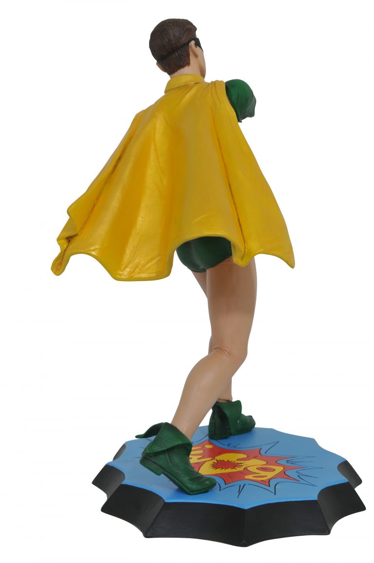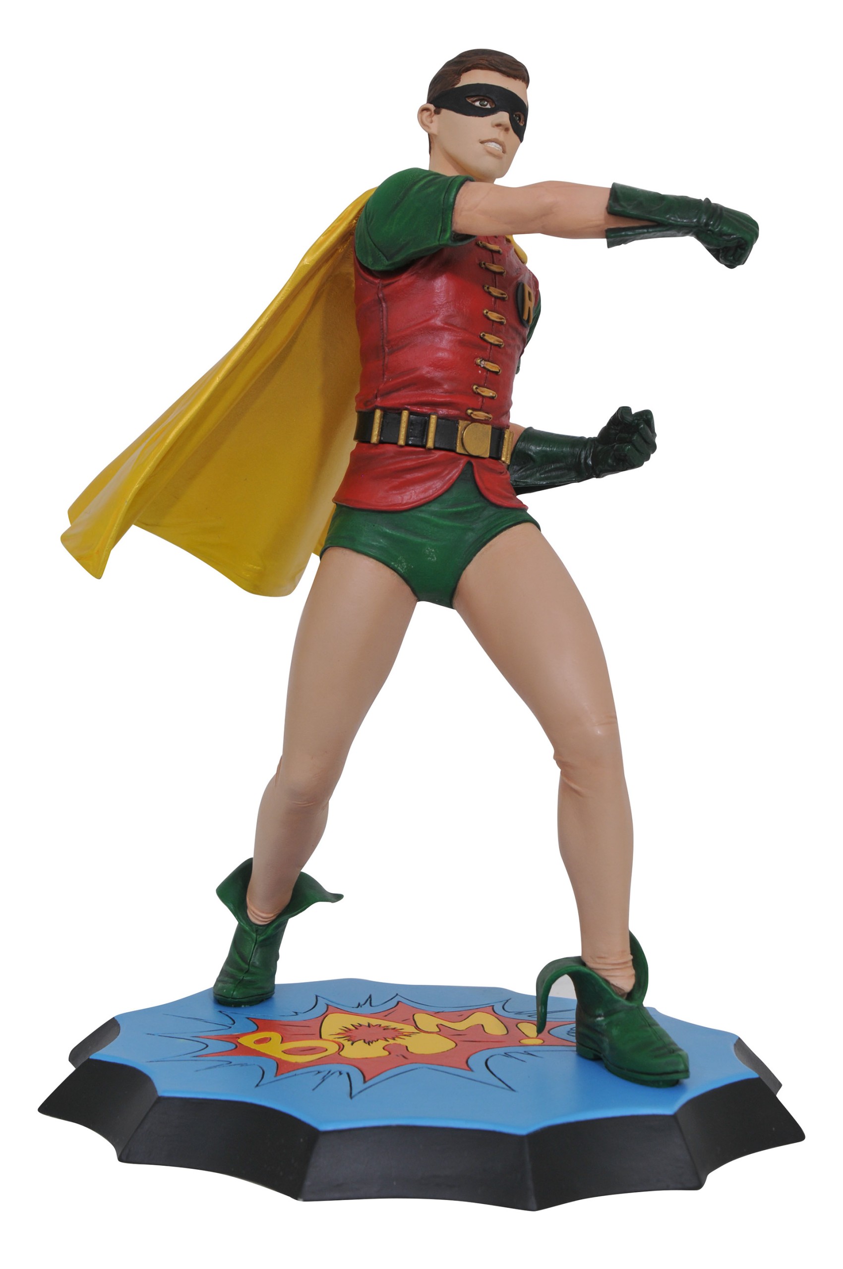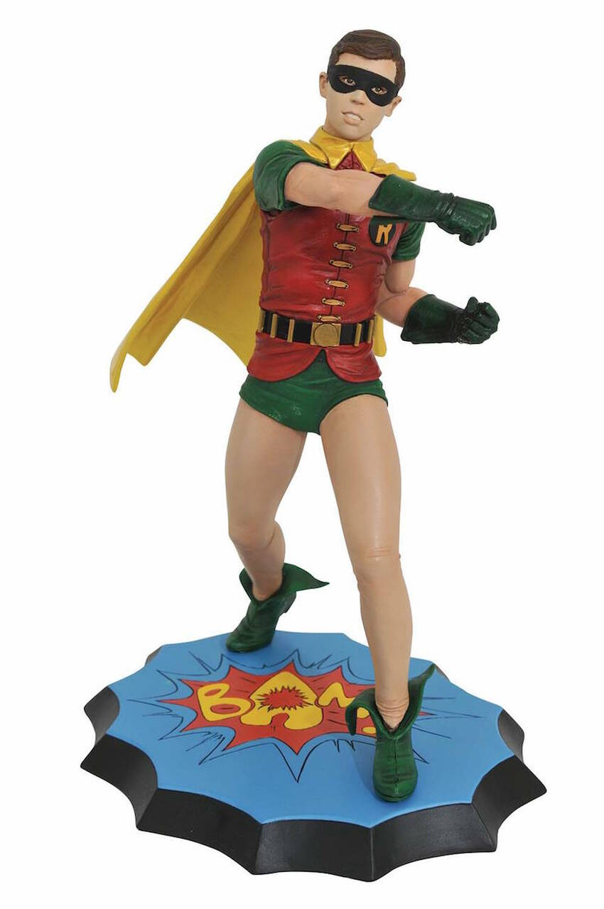 A Diamond Select Toys release! The Boy Wonder is ready for battle! The newest entry in the Premier Collection of statues based on the Batman Classic TV Series, this highly detailed resin statue depicts actor Burt Ward as Batman’s partner-in-crimefighting, Robin! Measuring approximately 10 inches tall and standing atop a sound-effect base inspired by the Batman Classic TV Show, this statue is in scale to the other statues in the series – pair it with Batman to throw a double punch at an opponent! It comes packaged in a full-color box with a hand-numbered certificate of authenticity. Sculpted by Jean St. Jean!