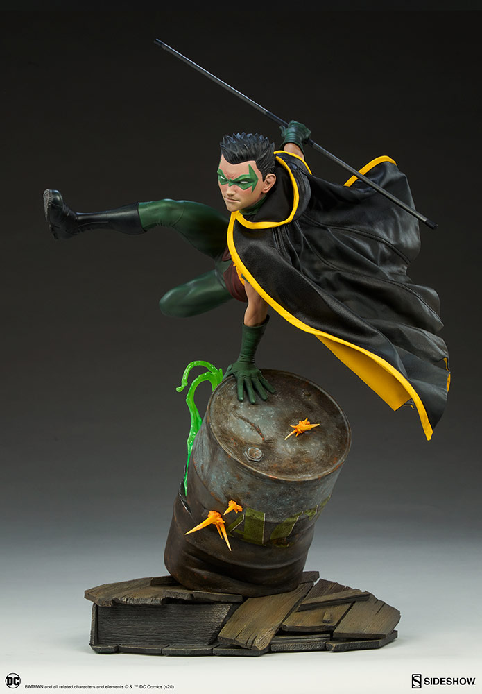 The Robin Premium Format™ Figure measures 19” tall as the Boy Wonder leaps into action at an Ace Chemicals warehouse, dodging gunfire and noxious green ooze spilling out from a broken barrel. Eager to aid Batman in the fight, Robin is equipped with a battle staff for beating up bad guys with maximum reach.
