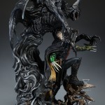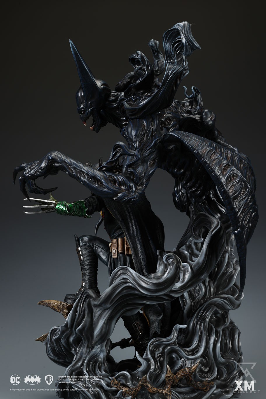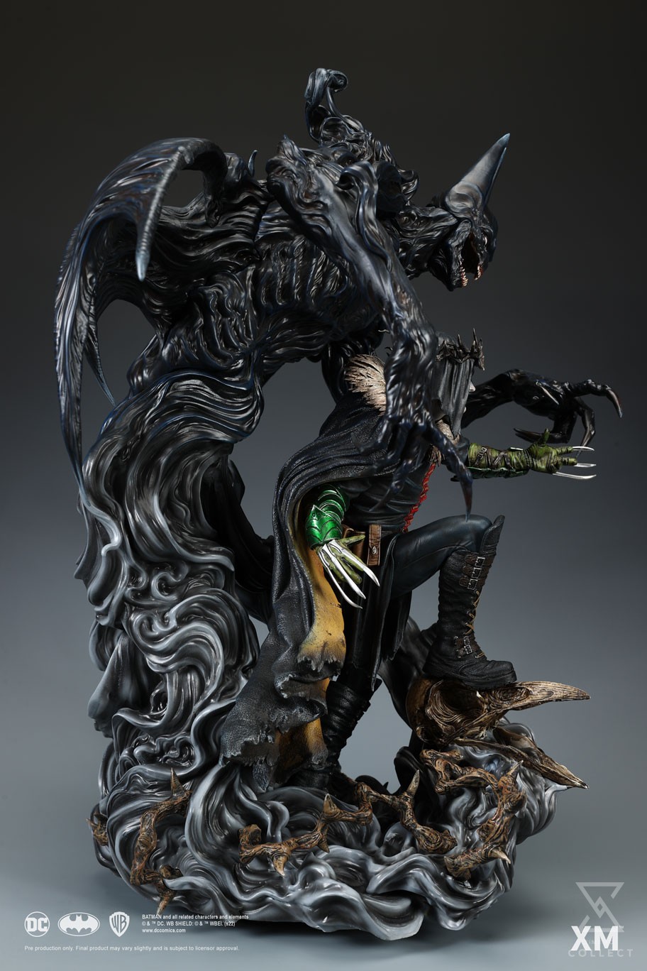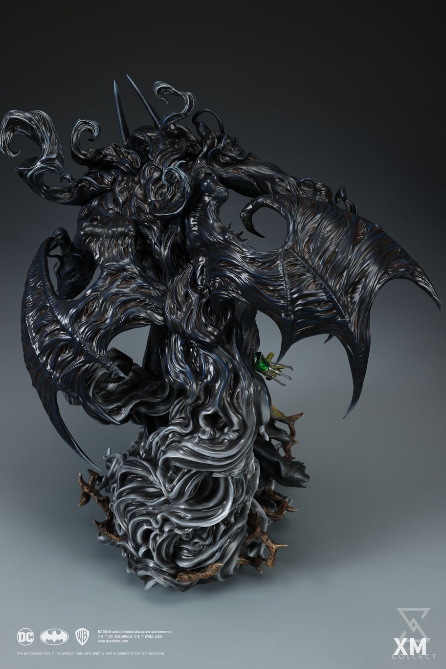 With this statue, the XM Team drew heavy inspiration from Riccardo Frederici’s original variant cover featuring Robin King from Dark Nights Death Metal #3. Featuring Bruce Wayne from the Dark Multiverse as Robin King, he stands atop a dried-out skull of a bird within the void. Wearing a crown of thorns, he sports a black domino mask with white eyeholes and a black overcoat with a yellow utility belt bearing a bird’s skull on the buckle. He also comes armed with green gauntlets bearing three claw-like blades on each hand.