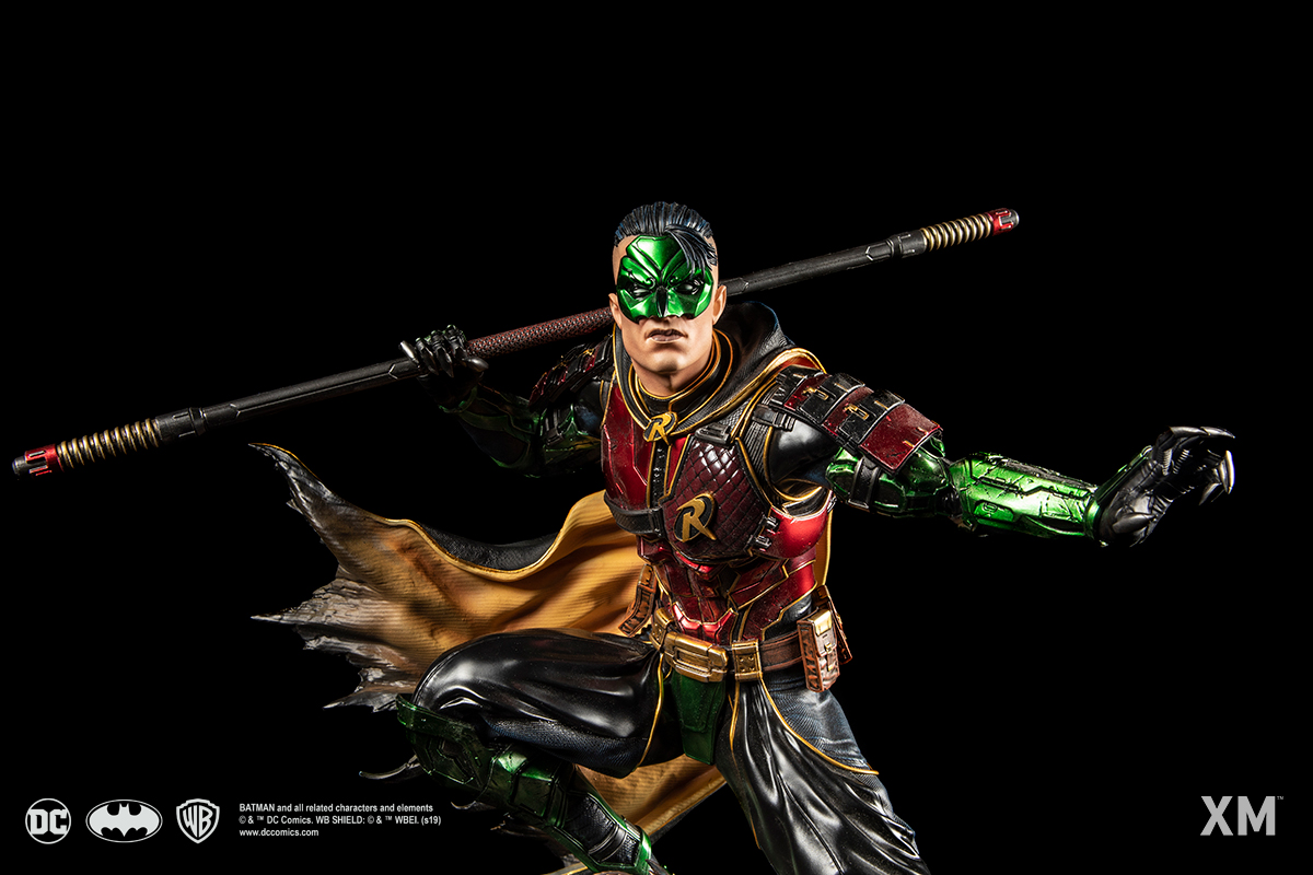 XM Studios is excited to present our next DC Premium Collectibles series statue, Robin! Immortalized in amazingly detailed 1:4 scale cold-cast porcelain. Each painstakingly handcrafted statue is individually hand-painted with the highest possible quality finish. This unique line is a result of creative collaboration between Warner Bros. Consumer Products and XM Studios to showcase the Batman universe in exotic settings as you’ve never seen. Every kid wants to be Batman, but do you have a lifetime of training? A billion-dollar fortune? The dream gets dashed pretty quickly. So OK, maybe you can’t be Batman… but that doesn’t mean you can’t be adopted by him. And just like that, Robin the Boy Wonder made the kid sidekick an icon.