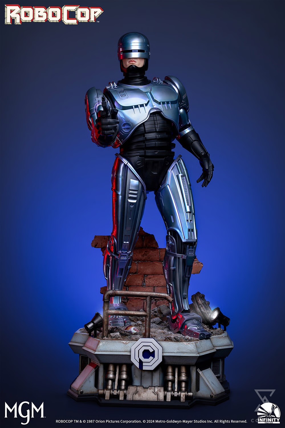 Infinity Studio brings this legendary character to life with the Robocop 1:2 Silicone Statue, allowing fans to relive the movie’s most memorable moments and honor this timeless classic. Crafted with top-grade platinum silicone, the face under the helmet is meticulously sculpted to capture Robocop’s cold and resolute expression, faithfully reproducing his on-screen appearance.