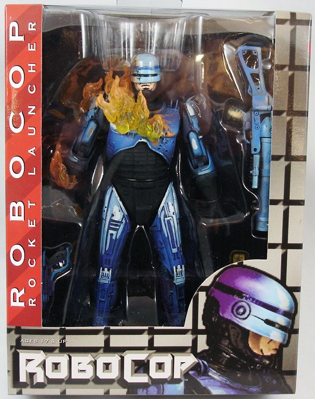 Series 2 includes two versions of Robocop with paint deco that re-creates the video game shading. Flamethrower Robocop includes a massive flamethrower accessory with removable “flame spray” attachment. Fire-Damaged Robocop is partially covered in sculpted flames and comes with rocket launcher and laser pistol accessories. Both figures are fully articulated and stand approximately 7″ tall.