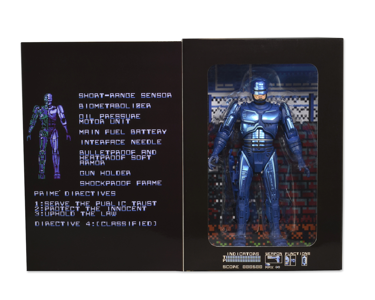 NECA’s RoboCop (1989 Video Game Appearance) is a fully articulated 7-inch figure with spring loaded holster and Auto-9 Pistol. Robo is painted in the blue-ish purple video game deco with a hint of cel shading. This figure comes in a special window box packaging with opening flap to re-create the look and feel of the classic 1989 video game packaging