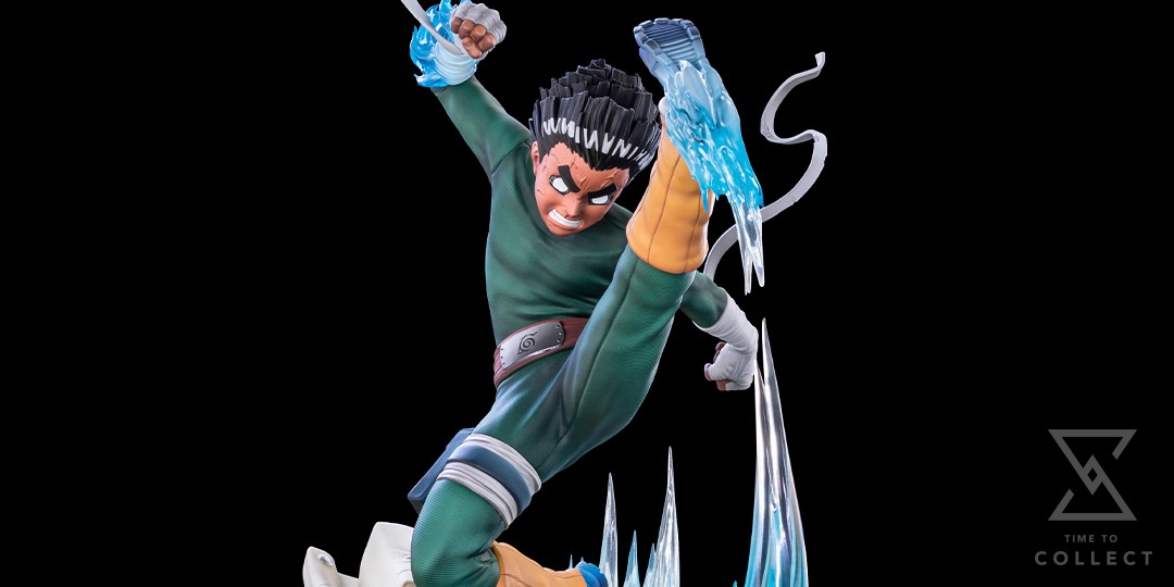 This statue depicts Rock Lee revealing his true power and impressive shinobi abilities, resulting from an unerring determination and extreme training! Inspired by the episodes “Gaara vs Rock Lee, The Power of Youth Explodes” and “The Fifth Gate: A Splendid Ninja is Born” from Naruto, Might Guy’s favorite student shows here his perfect mastery of taijutsu in his fight against Gaara! Allowed by his sensei to remove his weights, he frees himself dropping them loudly to the ground in a cloud of whitish resin dust, as observed on the base. The taijutsu expert, looking like his master in his green jumpsuit with Konoha headband belted at the waist and orange gaiters, can now use his incredible speed and great power! Concentrating all of his strength, with his pupils turning white and his darker complexion, his visible veins and black hair thrown into the air, Rock Lee is seen here opening the fourth Gate of Pain and then the fifth Gate of Limit to totally unleash his flow of chakra and go beyond his limits! As seen with the blue chakra flames emanating from his body and the moving headbands around his arms, he sets out to use his unstoppable speed and ultimate technique to shatter the sand armor of his indestructible adversary: the Reverse Lotus Flower! Throwing his opponent into the air, the «nice guy» embodying the Power of Youth reminds everyone that he will not back down from anything, ready to win any fight as a real shinobi!