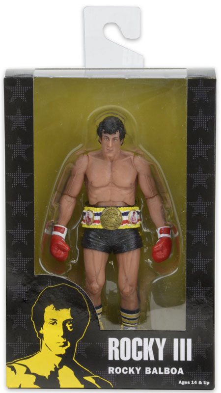 Series 1 focuses on Rocky III, in which Rocky Balboa fights and is beaten bloody by Clubber Lang, losing his world championship. It debuts a brand-new Rocky figure in black trunks based on posters and promo art for the movie, which comes with an incredibly detailed championship belt accessory. The assortment also includes three re-issued figures: two versions of Clubber Lang in both black and blue trunks with unique head sculpts, and a gold trunks version of Rocky.