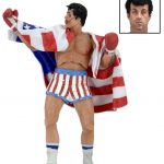 Series 2 focuses on Rocky IV, in which Rocky must avenge the death of his friend at the hands of Ivan Drago, the Russian gold medalist. It debuts a brand-new Apollo Creed figure in full stars-and-stripes boxing regalia, complete with alternate head sculpt, removable coat and top hat. The assortment also includes two versions of Ivan Drago in both yellow and red trunks with unique head sculpts, and an American Flag trunks version of Rocky with 2 head sculpts and an American flag that can be draped over his shoulders. Realistic sculpts feature the likenesses of actors Sylvester Stallone, Carl Weathers and Dolph Lundgren. These 7″ scale figures are fully articulated and ready to take their one-in-a-million shot at the dream.