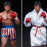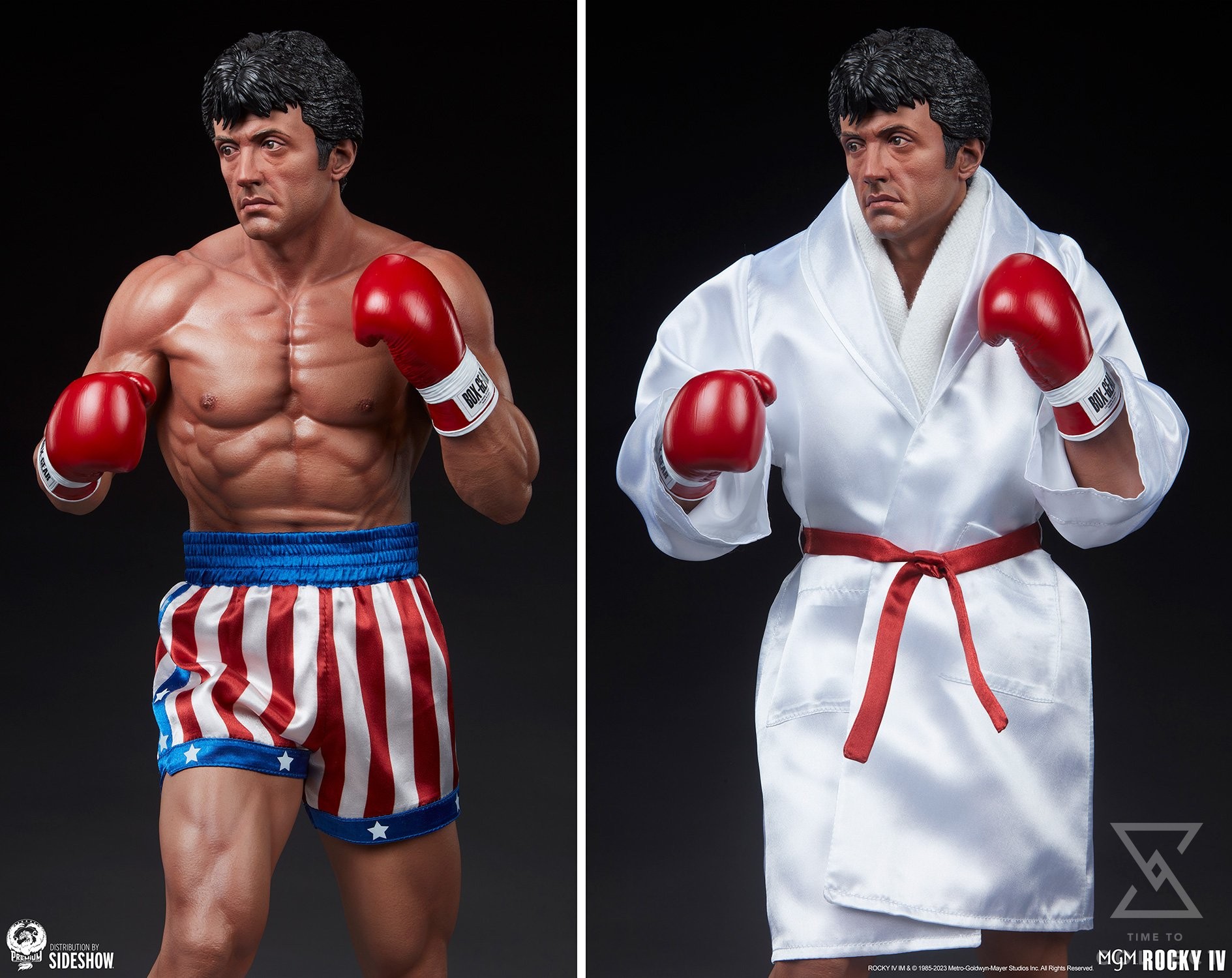 The Rocky IV 1:3 Scale Statue sports a mixed media costume with custom-tailored fabric elements to give collectors multiple fight-ready display options on their shelf. His red, white, and blue shorts feature a patriotic stars and stripes pattern and an elastic style waistband. The collectible statue additionally comes with a matching white towel and white robe that reads “Balboa” across the back, which can be displayed on the included rack when not on the figure. Rocky also has sculpted red boxing gloves and sculpted white socks and boots to complete his athletic look.