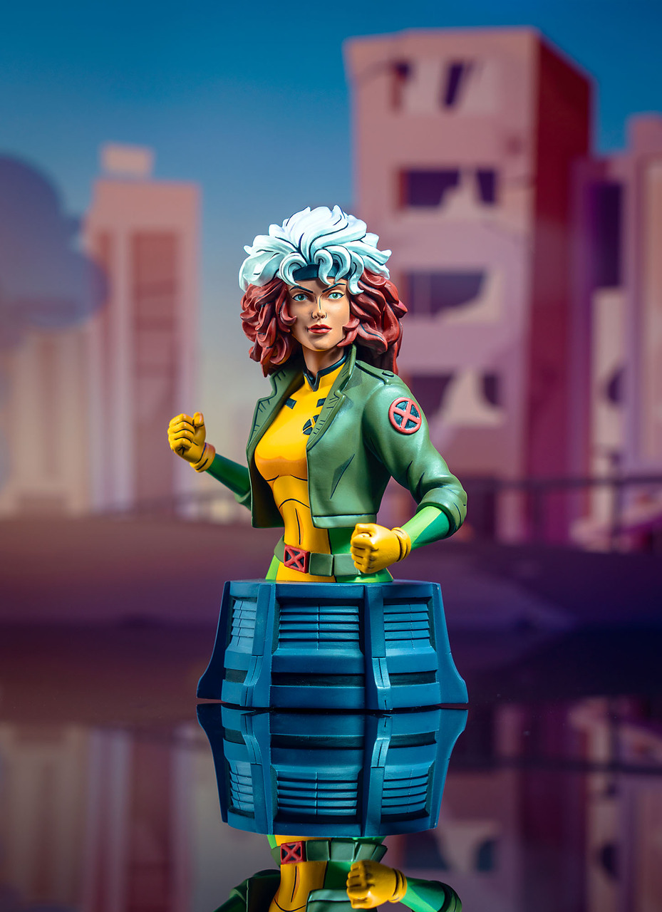 Mutant pride, shugah! Southern belle Rogue enters the fray as the newest bust based on X-Men: The Animated Series! Capturing the cartoon’s costume and colors, this approximately 6-inch tall, 1/7 scale bust sits on a grey pedestal and is in scale to the rest of the X-Men. Includes a numbered certificate of authenticity in a full-color box. Limited to 3,000 pieces. Designed by Barry Bradfield, sculpted by Paul Harding.