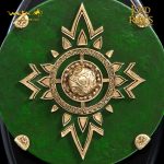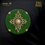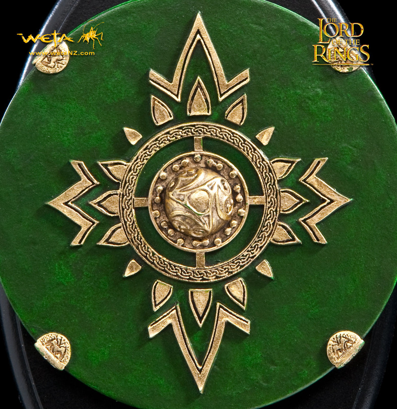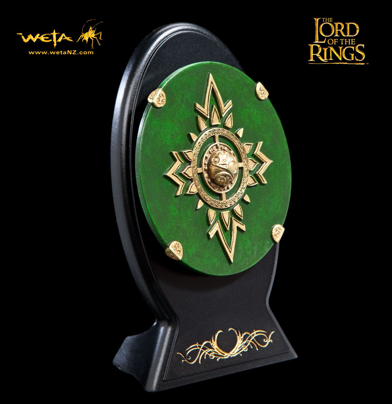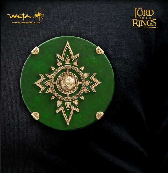 This is an exact miniature version of the actual prop Weta made for The Lord Of The Rings, made by the same artists and craftsmen who made the original. Made from metal, these shields have a pin on the back and can be worn as a badge or be displayed on the magnetised polystone stand.