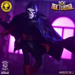 The One:12 Collective Doc Nocturnal is shrouded in darkness – wearing a hooded leather-like sleeveless tunic with skull insignia, fitted bodysuit, removable cloak, and a modular utility belt.