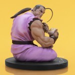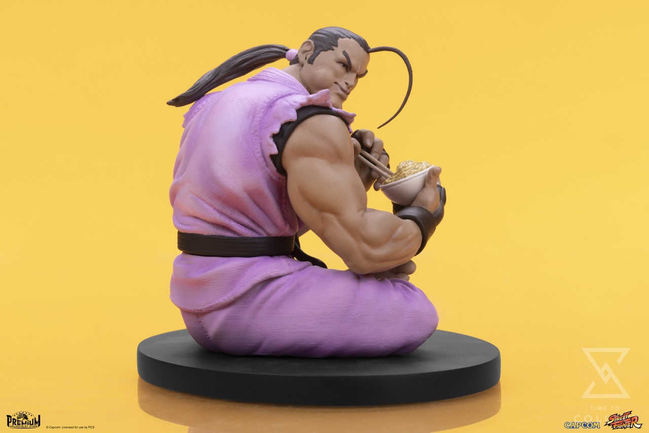 Dan on the other hand is seated casually, legs crossed, slumped over a steaming bowl of noodles. He peers over his shoulder, as if irritated by the interruption of his meal, but not enough to slow down. His portrait is expertly sculpted to depict not only his annoyance…but also his clear mouthful of food. His pink gi is sculpted in great detail and is contrasted with his dark brown gloves and rash guard. A pink hair tie matching his gi holds his tight ponytail in place, save for a single strand of hair arcing out from his forehead.