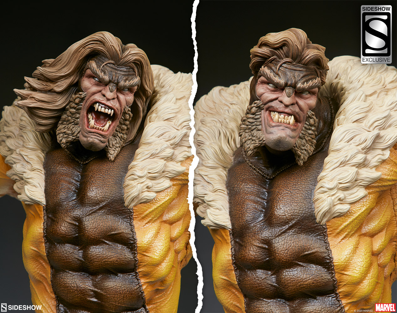 The Exclusive Edition of the Sabretooth Premium Format™ Figure includes an alternate classic portrait with short hair and a fanged smirk. Switch up the look of this snarling mercenary with this additional display option.