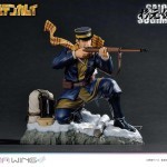 The textures in his leather belt, boots, and utility bag, as well as the wrinkling in his clothing, all add to the dynamic nature of his pose. The highly detailed rifle and bayonet give the viewer a sense of tension. A pack with food rations is placed behind him on a base that portrays the harsh climate of Hokkaido. The rugged formations of snow-covered rocks and trees create an immersive environment. Earning the title “Sugimoto the Immortal” for his savage fighting style, this war veteran, caught up amidst the survivalist competition over the Ainu’s fortune of gold, will make an excellent addition to your collection!