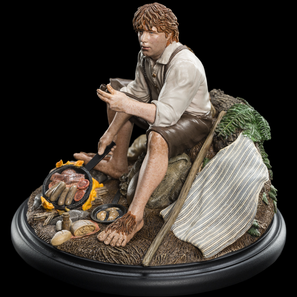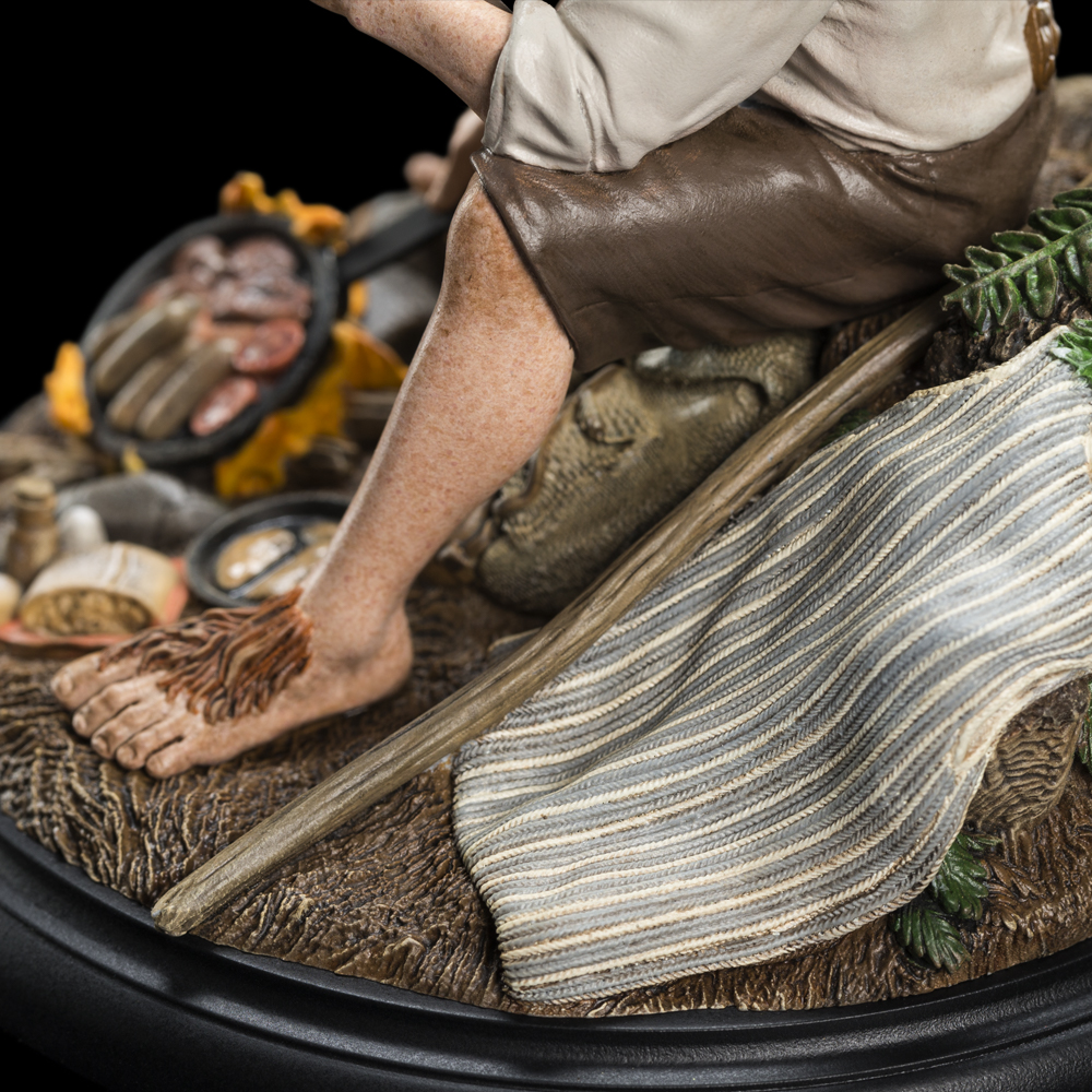 The loyal friend of Frodo Baggins and gardener at Bag End, Samwise Gamgee is a stout-hearted Hobbit of simple tastes and pleasures. When pressed into service as Frodo’s companion and guardian on a perilous journey, brave and dependable Sam demonstrates the faith Gandalf the Grey placed in him was well-deserved. Promising not to let Frodo out of his sight, he holds true to his word, an unshakable ally in even the most daunting of circumstances. It is the quiet moments shared together on their quest that make the Hobbits the fastest of friends. Pausing to rest near the borders of the Shire, Sam stirs their dinner over a campfire when a lilting melody upon the breeze tickles his pointed ear. Born upon the wind is the doleful song of a company of Wood Elves on the Great Western Road, bound for the sea and the Undying lands beyond the horizon. Watching them go, Sam feels the magic of the world slipping slowly away, and his sweet heart is touched with sadness.
