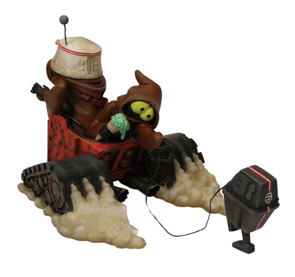 The Jawas are a scavenger species. They comb the deserts of Tatooine in search of discarded scrap and wayward mechanicals. Using their cobbled-together weaponry, they can incapacitate droids and drag them to their treaded fortress-homes, immense sand-scarred vehicles known as sandcrawlers. This Rotocast Vinyl piece stands 5.5in x 6.5in x 9.25in.