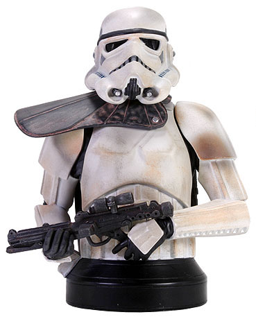 The sandtrooper is a desert terrain stormtrooper equipped with modified armor and gear to better withstand missions in harsh, arid locales like Tatooine. While their armor is superficially similar to that of the standard stormtrooper, advanced cooling systems in both their helmets and suits offer these troopers protection from the relentless heat. The Sandtrooper Corporal comes with a black pauldron that denotes rank. The edition size for the Sandtrooper Corporal mini bust has been set at 2500 pieces. During Celebration III the quantity of Sandtrooper mini busts for purchase will be allocated on a per day basis.