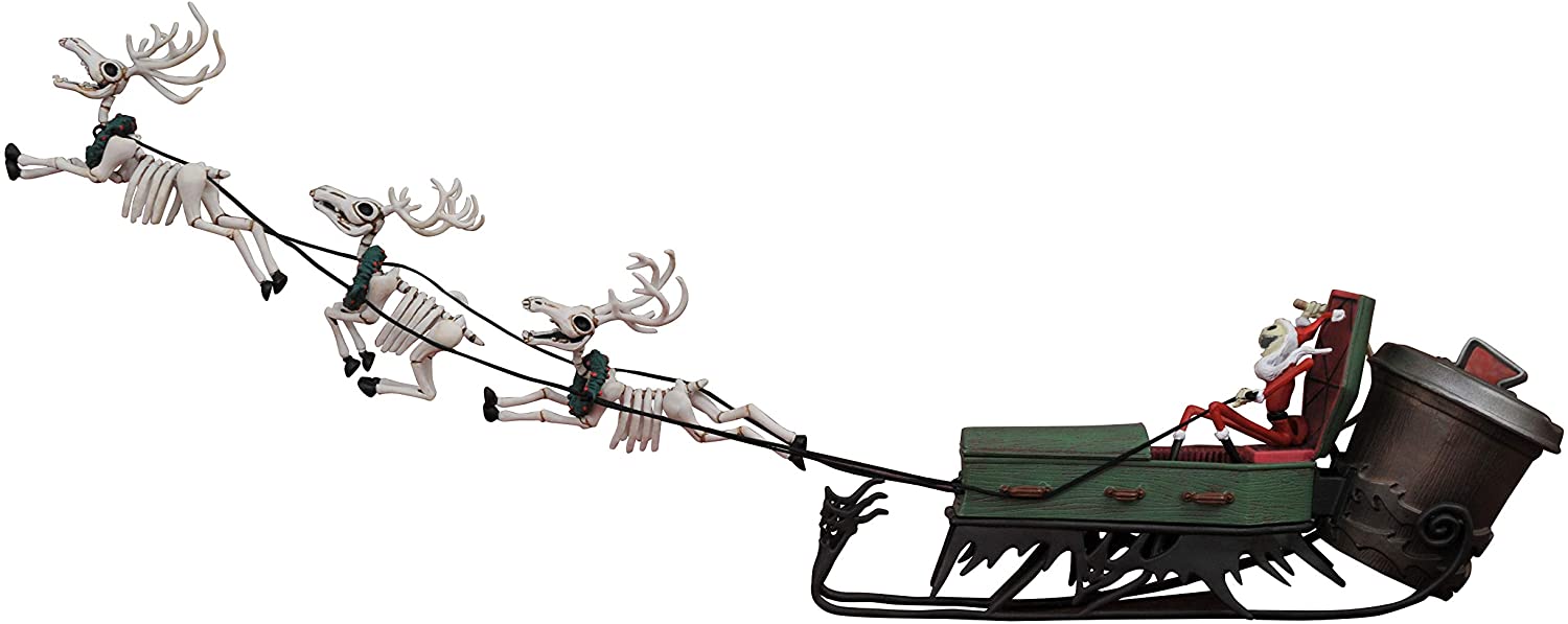 A Diamond Select Toys release! Sandy claws is coming! This deluxe PVC set from Tim Burton’s the Nightmare before Christmas Features Jack in his coffin sleigh, pulled by three skeletal reindeer and led by a tiny figurine of zero! Set it up on your mantle to let everyone know that a horrific Christmas is on its way! Packaged in a full-color window box