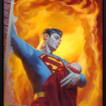 Krypton-born, Kansas-raised — Clark Kent is a hero through and through. In Saving Grace, the Man of Steel shows a softer side to his heroics as he rescues an infant from a burning building. Kal-El ensures the safety of this precious cargo by wrapping the newborn child in his signature red cape just as his parents once did for him when they saved him from the explosion of their home world. The scene is framed through a broken window as smoke billows and flames provide a heated contrast to Superman’s iconic blue bodysuit. Despite being the last of his kind, Kal-El’s own saving grace is that he is able to protect the people of Earth at every age — including a baby named Grace.
