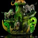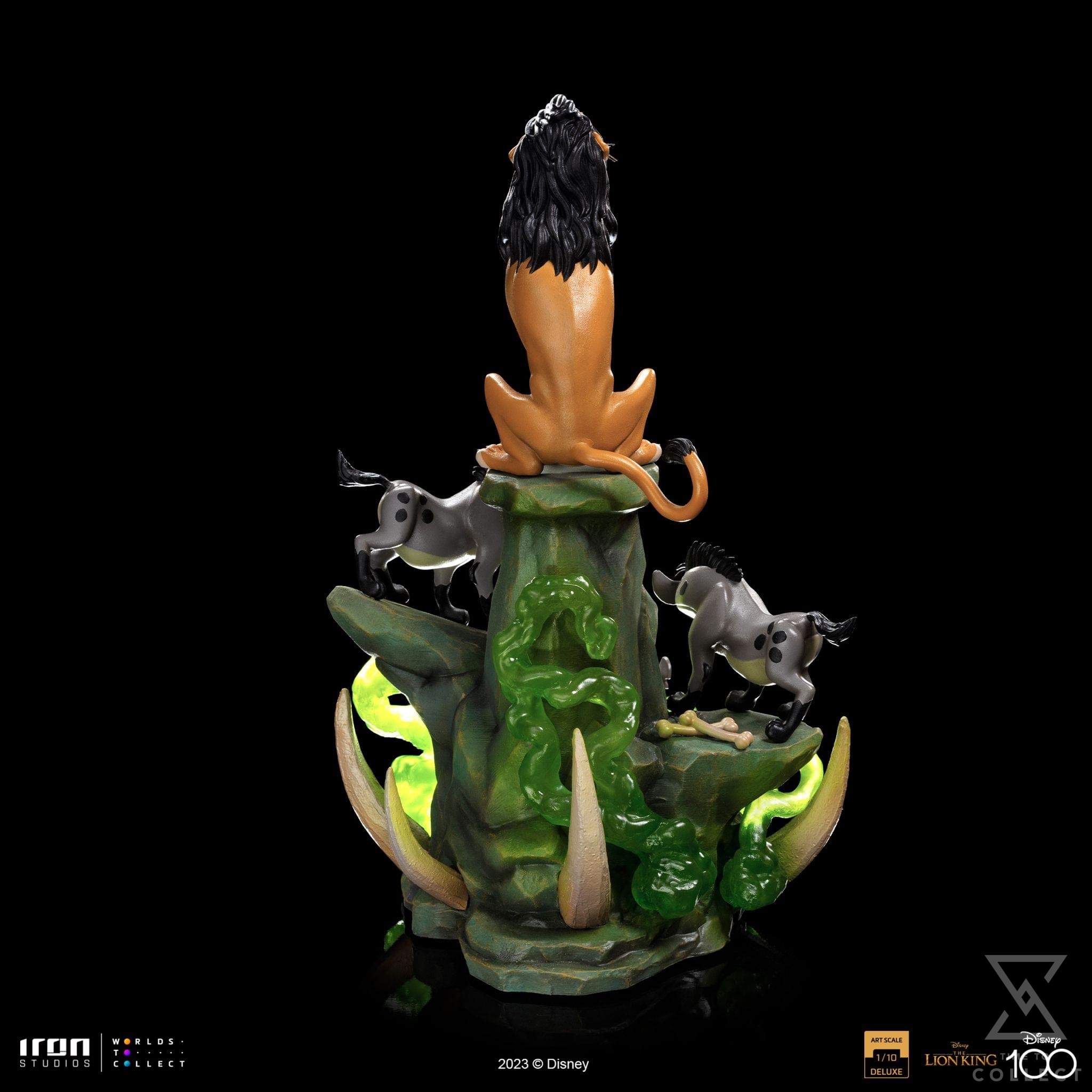 Arrogant, narcissistic and always thirsty for power, the slender feline with brown fur, black mane, green eyes, with a striking scar over the left eye that determines its name, settles down sitting on top of a rock in the amazing territory known as the elephant cemetery. Ever self-absorbed, the former leader of the Lion Guard assumes a position of power, hatching his nefarious plans to take the throne as reigning monarch of the Pride Lands, a vast savannah territory controlled by a pride of powerful lions in Africa. Celebrating 100 years of Disney, Iron Studios proudly presents the “Scar Deluxe – The Lion King – Art Scale 1/10” statue, featuring the iconic villain from The Lion King, the 32nd animated feature film produced by Walt Disney Pictures in 1994, a film that won at the time the second highest grossing of all time, with the villain on a base on his rocky pedestal surrounded by ivory tusks that refer to the sinister scenario of the elephant cemetery.