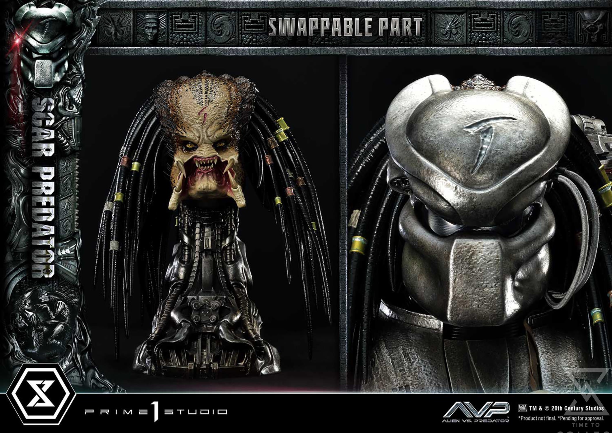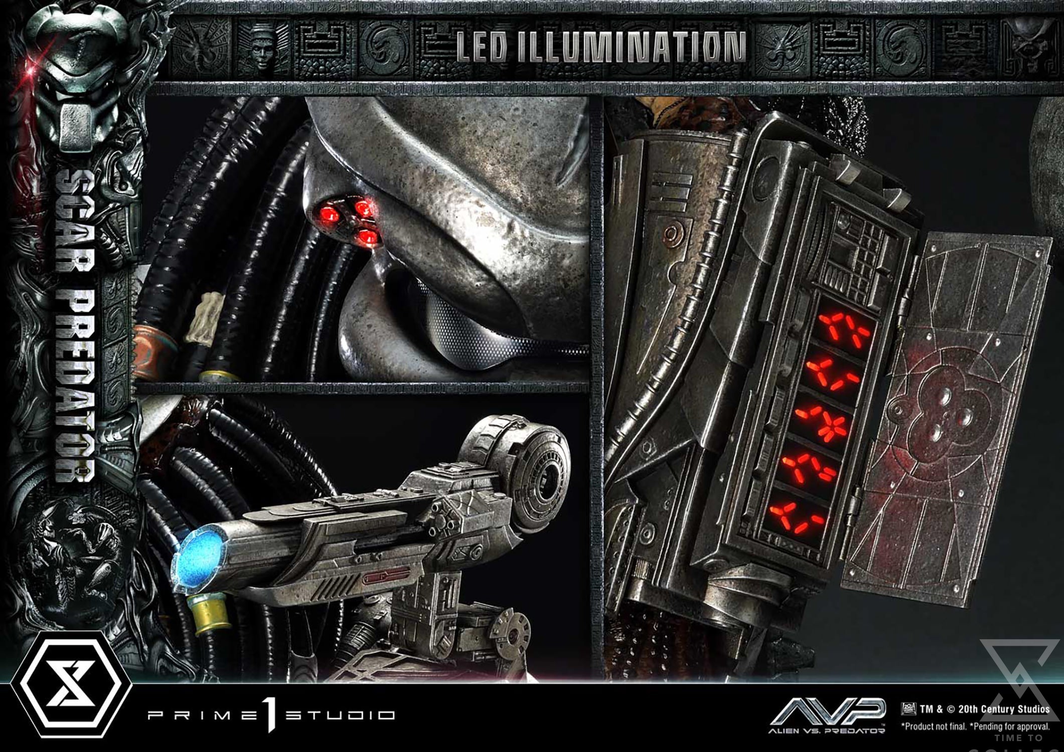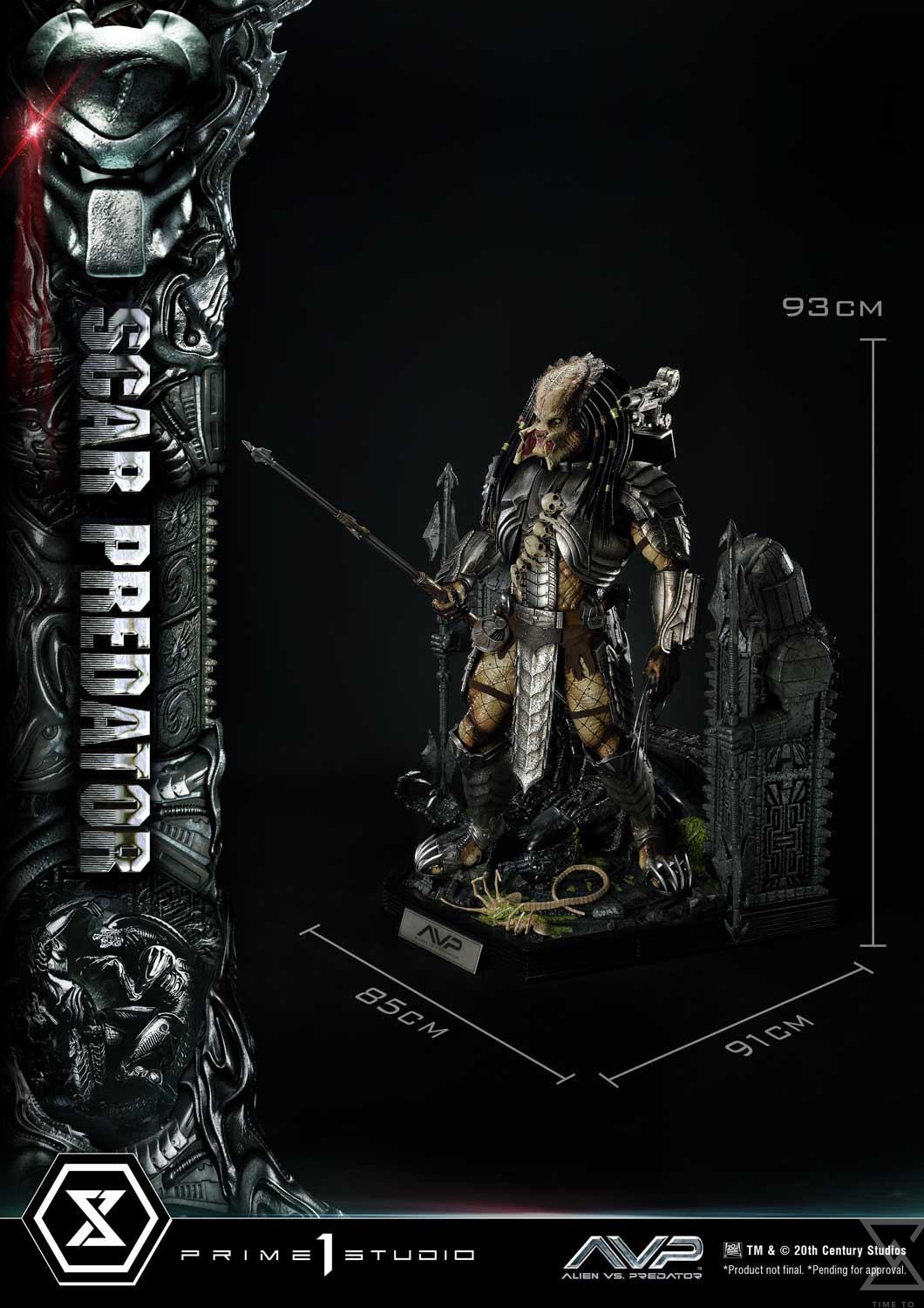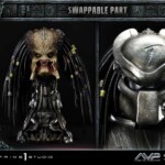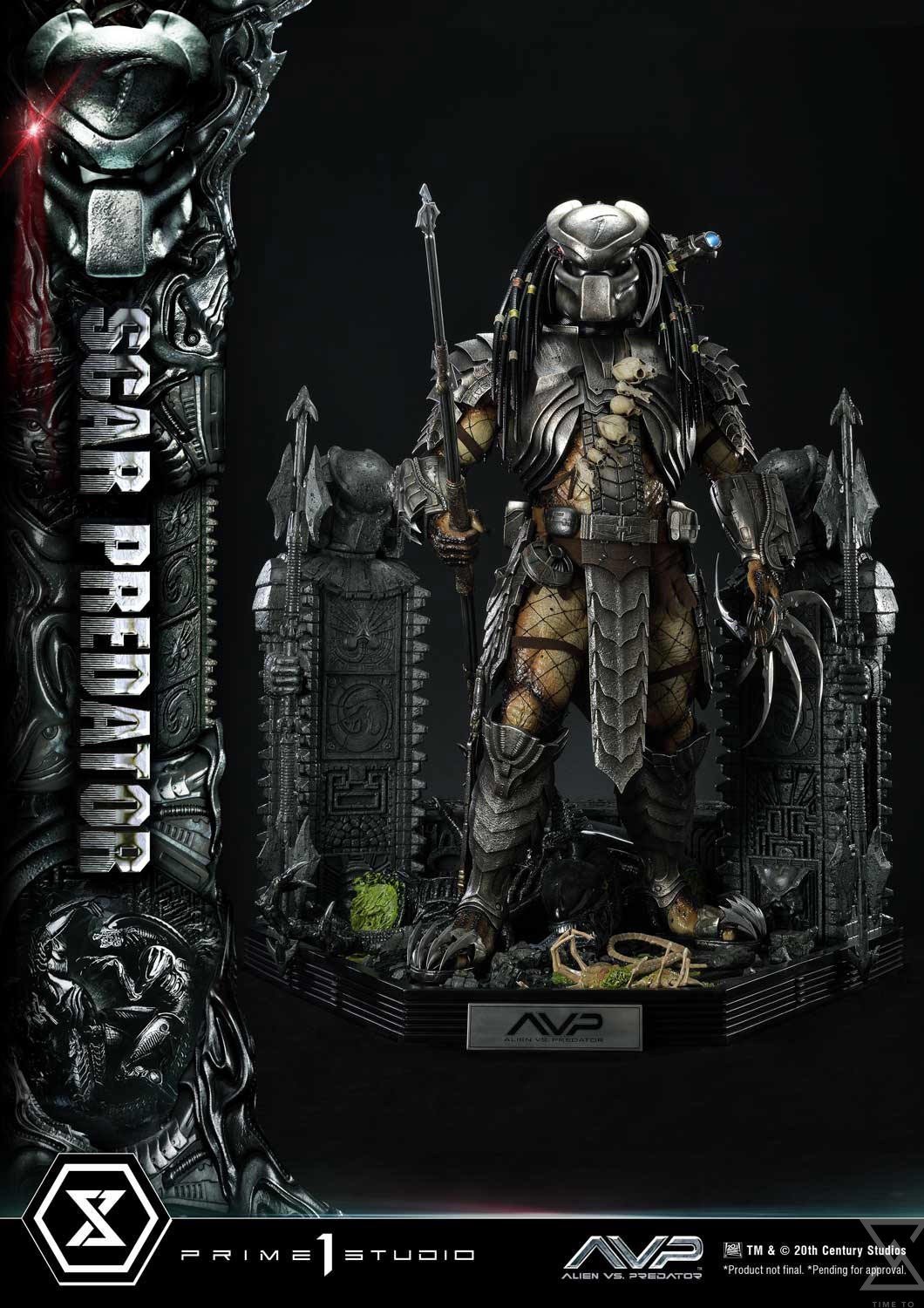Once again, the incredible artisans at Prime 1 Studio brought their A-game to bring this imposing and fearsome extraterrestrial hunter to life. At a whopping 36 inches tall, Scar is fully armored and equipped with an arsenal of advanced technology and brutal instruments of death. As usual, the immense dedication and attention to detail from our artisans and sculptors that went into crafting this remarkable Predator statue ensures the utmost level of accuracy. From each single strand of dreadlock to the tiny Xenomorph skulls and the shading of the skin and armor. You will definitely see and feel our commitment to perfection with this piece! The iconic Bio-Mask, features a distinctive mark on the forehead, referring to his name “Scar”. The Plasmacaster is ready to unleash its devastating energy blasts on any prey that’s unlucky enough to be targeted by the helmet’s targeting lasers, both of which are LED illuminated a bright blue and red, respectively. He holds in his right hand the Combistick, a spear-like weapon that serves to impale victims from a distance. In contrast, the gauntlet-integrated Wristblade, in its retracted state, is designed for close-quarters combat, allowing him to slice through flesh and bone with brutal efficiency. His left hand is equipped with a massive Shuriken, absolutely lethal when thrown. The Wrist Gauntlet is also equipped with LED illuminating functions. The base features ancient Yautja-constructed ruins and the corpse of a Facehugger that has been freshly slain. We have also included a second head, without the Bio-Mask to display Scar’s true face, and a head base for display. A silver “AVP” logo plate is also included for display at the statue’s base.