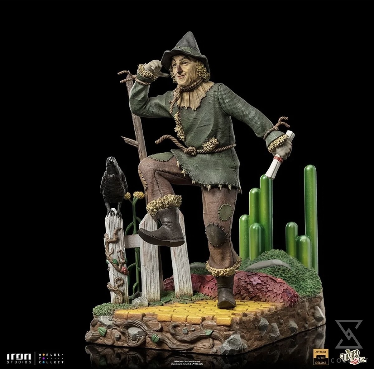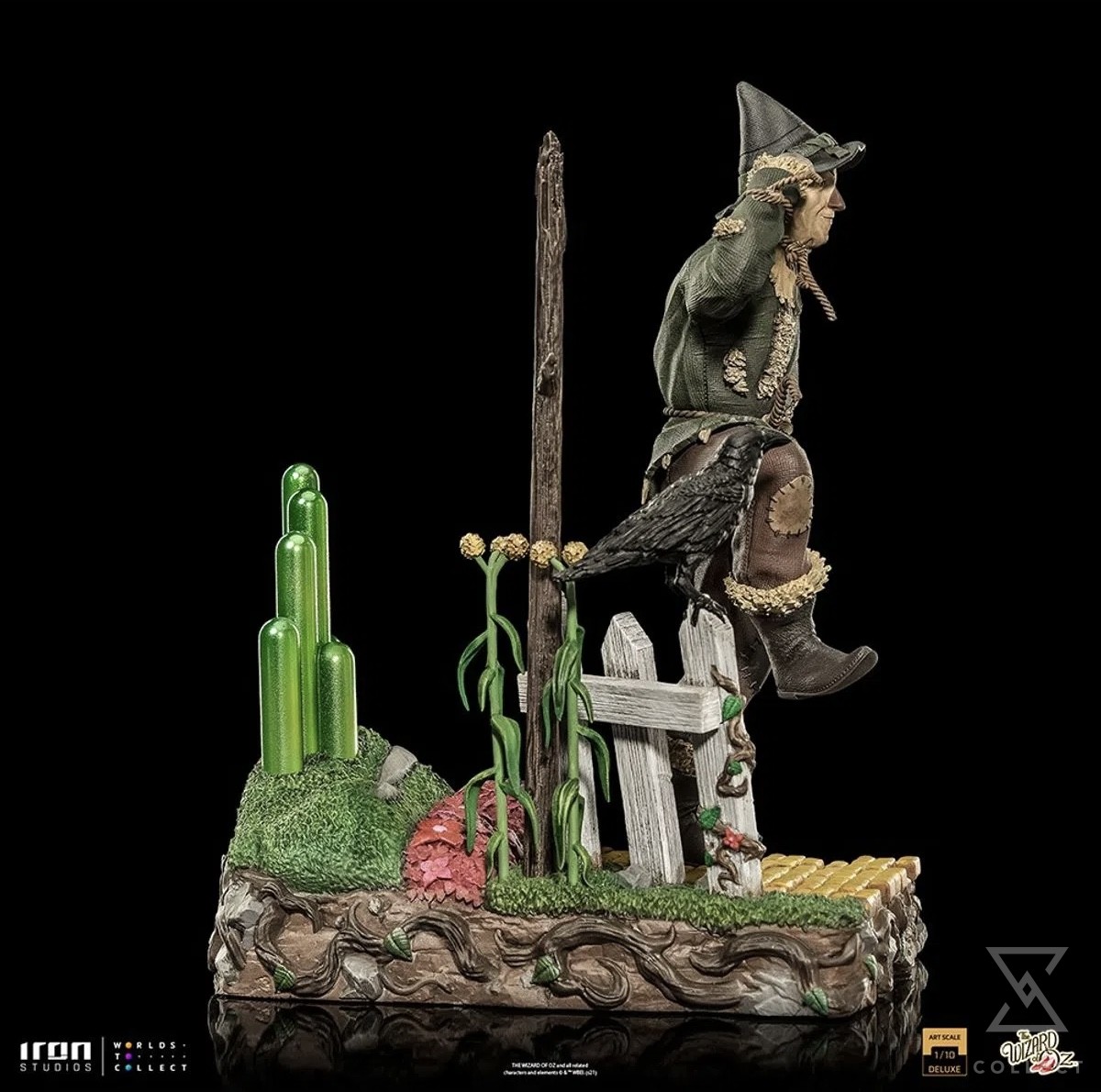 In a cornfield along the yellow brick road, the pretty girl from Kansas, Dorothy, arrives at a big intersection and, confused about which way she should follow, she finds a curious talking figure nearby to scare away the crows. Unhappy to fulfill his purpose of scaring the birds away, his biggest discontent was not having a brain. The girl tells him about her search for the Wizard that could help her get back home, and the stuffed figure joins her journey with the hope that the wizard can give him the so dreamed brain. With a finger on his head and bringing the diploma that proves his intelligence in one of his hands, Iron Studios bring the statue “Scarecrow Deluxe – The Wizard of Oz – Art Scale 1/10”, on a pedestal filled with details from the beautiful land of Oz, with the Emerald City in the background, the yellow brick road, and the Scarecrow played by Ray Bolger next to the cornfield post and fence with one of the crows he tries to scare in vain.