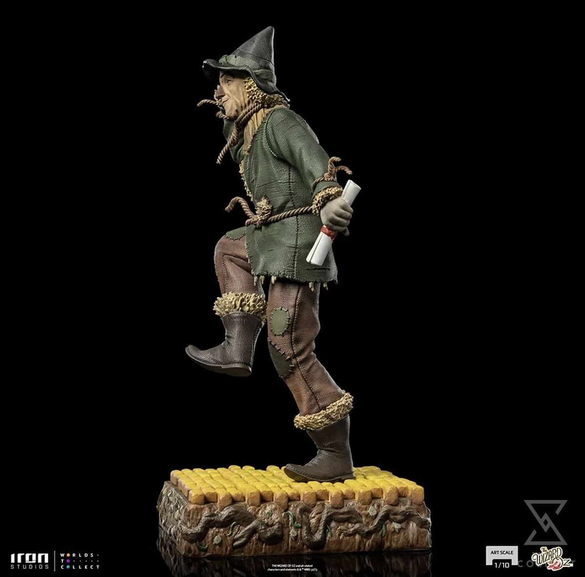 In a cornfield along the yellow brick road, the pretty girl from Kansas, Dorothy, arrives at a big intersection and, confused about which way she should follow, she finds a curious talking figure nearby to scare away the crows. Unhappy to fulfill his purpose of scaring the birds away, his biggest discontent was not having a brain. The girl tells him about her search for the Wizard that could help her get back home, and the stuffed figure joins her journey with the hope that the wizard can give him the so dreamed brain. With a finger on his head and bringing the diploma that proves his intelligence in one of his hands, Iron Studios bring the statue “Scarecrow – The Wizard of Oz – Art Scale 1/10”, with the wise character over a pedestal of the yellow brick road.