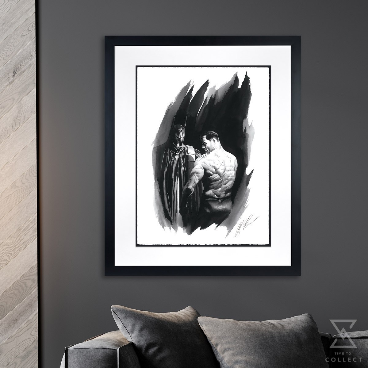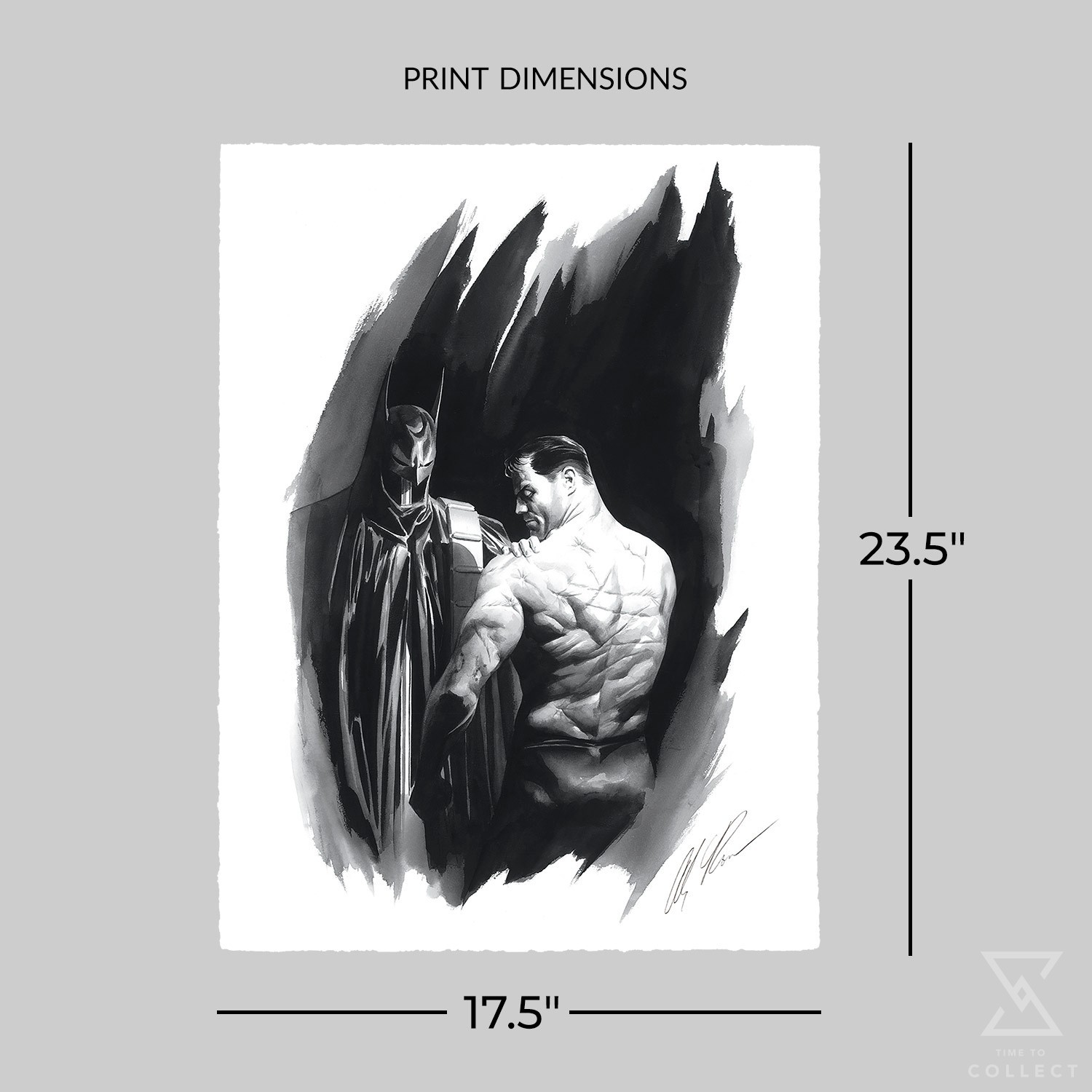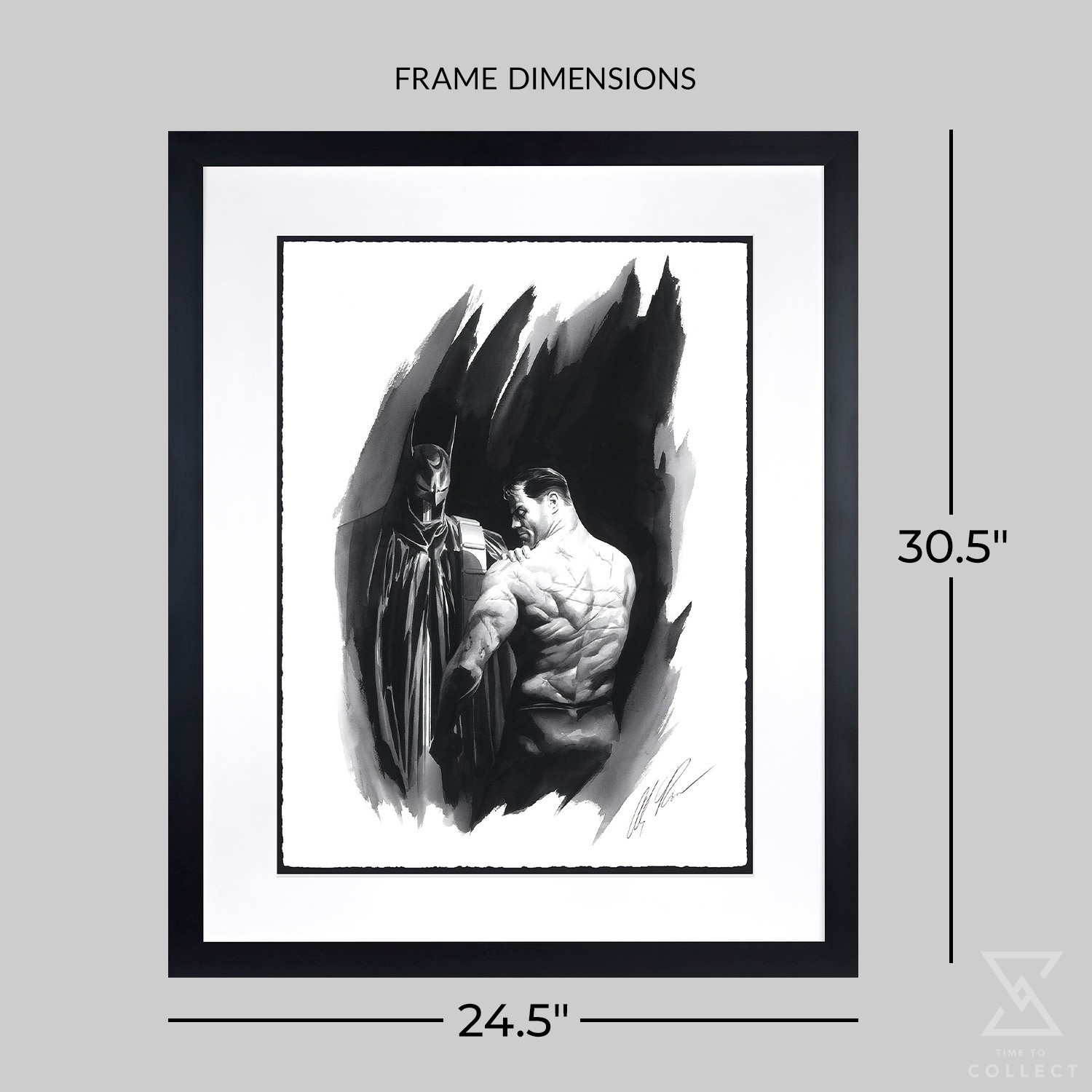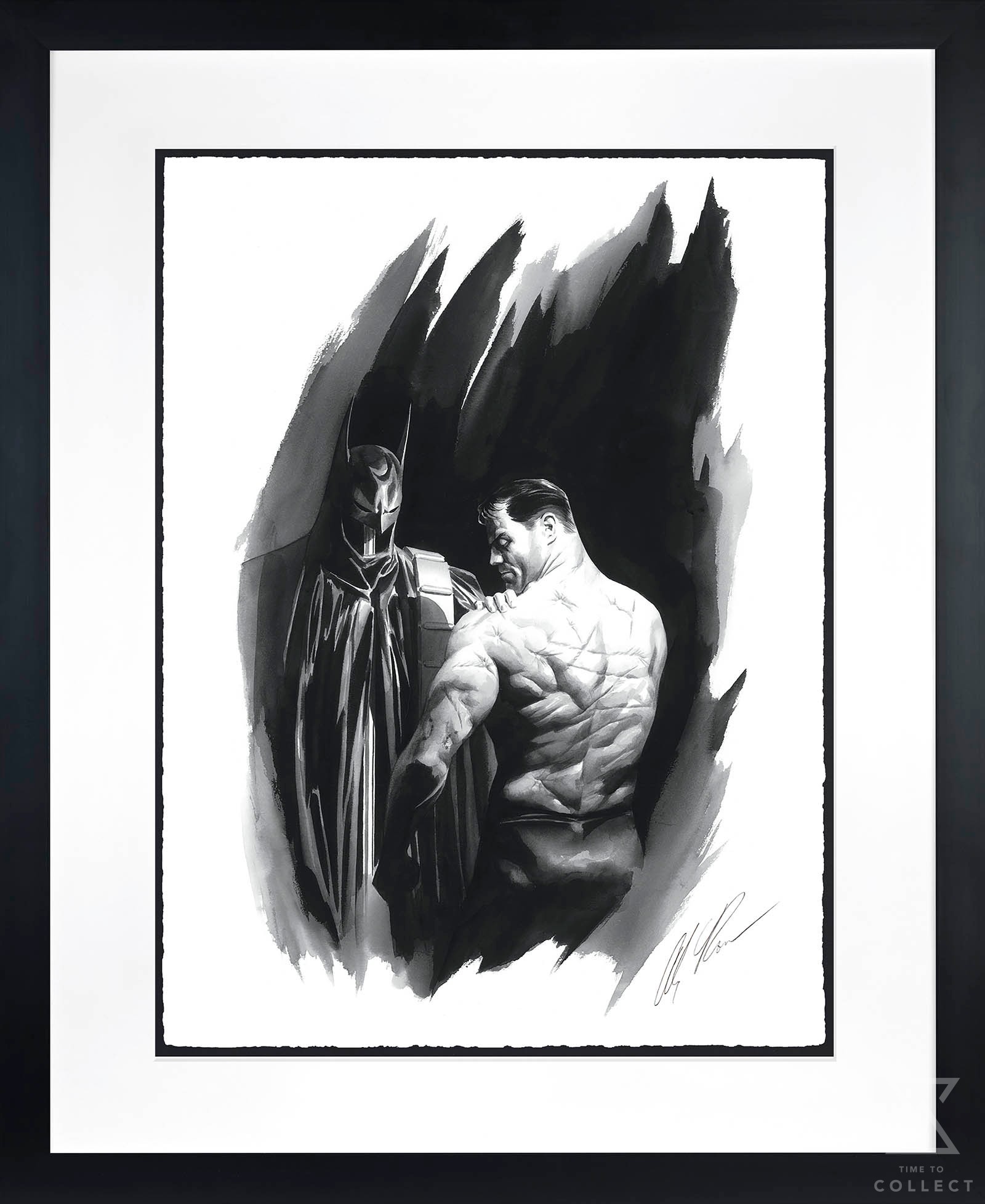 Originally created as a pin-up illustration for the comic Batman Black and White (1996), this realistic Batman art is now available to fans as an unframed archival print or in a custom framed presentation. Each Scars Fine Art Lithograph is hand-signed by Alex Ross and features hand-torn deckled edges as well as a Certificate of Authenticity as part of the limited edition of 195 pieces.