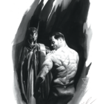 In the sanctuary of the Batcave, Batman bares his body, soul, and old wounds in an homage to The Brave and The Bold #197. Bruce stands unmasked in front of the legendary cape and cowl, his gaze traveling to old injuries. Each mark tells its own harrowing story of crime and punishment. With his skin marred by memories, the World’s Greatest Detective will find a moment of stillness before he dons the suit and slips into the shadows once more.
