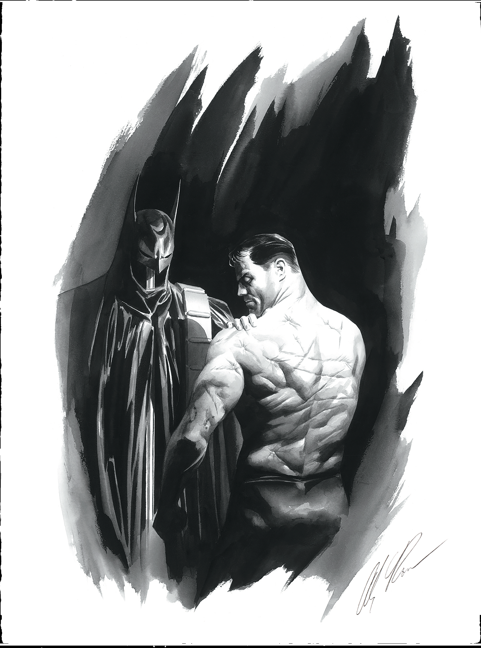 “I was inspired by a Joe Staton drawing, from a story about a future version of Batman marrying Catwoman. At one point in the story there was a scene when he was out of costume and she saw his back and gasped at all the scars. Until this piece, they remained unseen.” – Alex Ross, Mythology: The DC Comics Art of Alex Ross