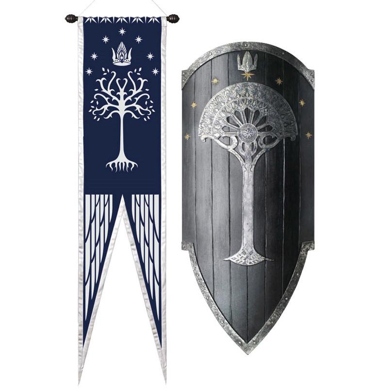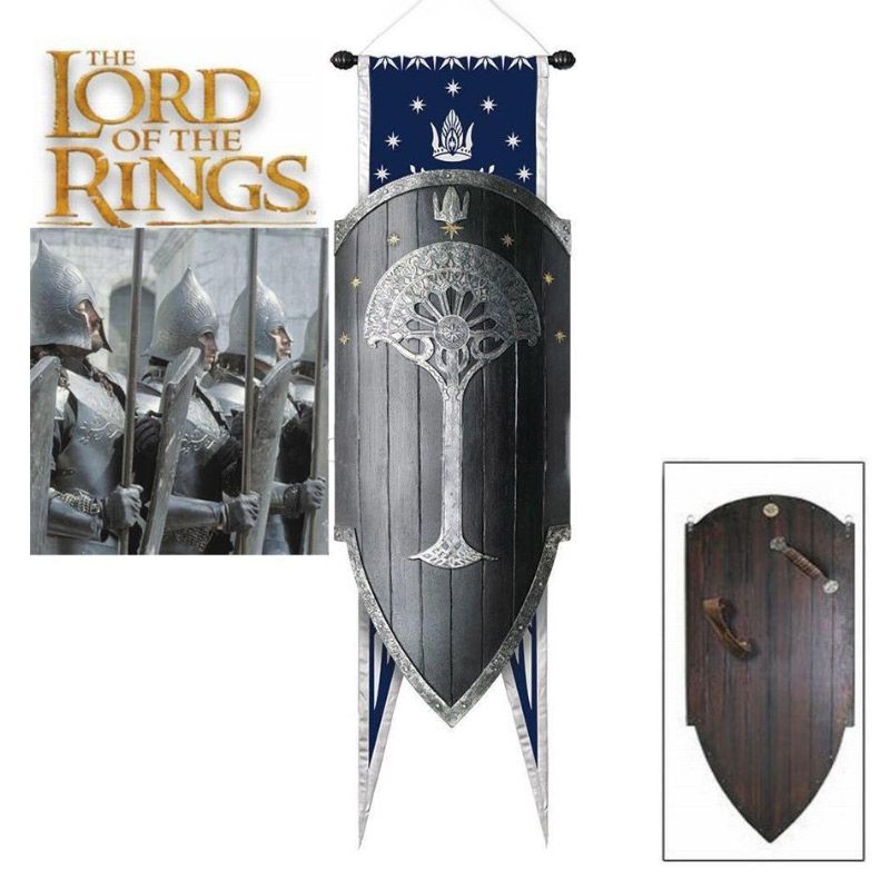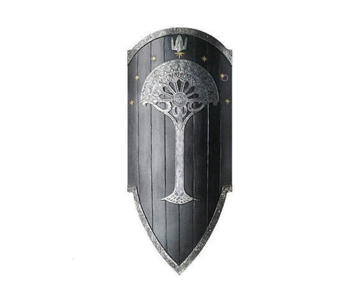 When the Last Alliance of Elves and Men marched against Sauron, the Men of Gondor carried these great war shields, a stalwart bulwark with which they defended against Sauron’s fell hordes and push them back into the black lands from whence they came. This reproduction shield is cast from solid resin with hand painted details and coloring combined with the innovative aging and weathering techniques, transform this Second Age Gondorian War Shield into a real life collectible. This beautiful edition is strictly limited to 1500 pieces worldwide and is individually serialized on a solid embossed metal plate mounted on the back of the shield to ensure authenticity. The front of the shield bares the “Tree of Gondor” surrounded by seven stars and a crown. These were royal symbols of the Gondorian people and showed their noble Numenorean lineage. Each shield is presented with a Kingdom of Gondor banner, to mount on a wall behind the shield. There are two rings on the back of the shield so that it can be hung on a wall. Handgrip is shipped unassembled for wall mounting (mounting brackets included), hardware and instructions to assemble included. Includes a certificate of authenticity.