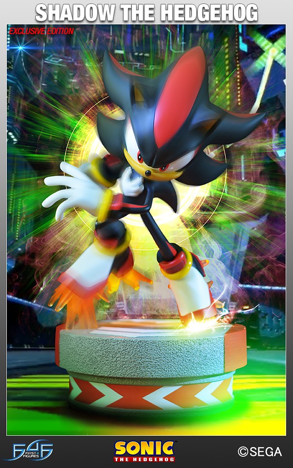 First 4 Figures is proud to present Shadow the Hedgehog. He stands 15 and a half inches tall to the top of his spines, and is in perfect scale with our Modern Sonic statue. He is speeding along Radical Highway in his trademark ‘skating’ running style. Flames erupt from his jet-powered boots as he tries to outrun and outmanoeuvre the G.U.N forces trying to chase him down.