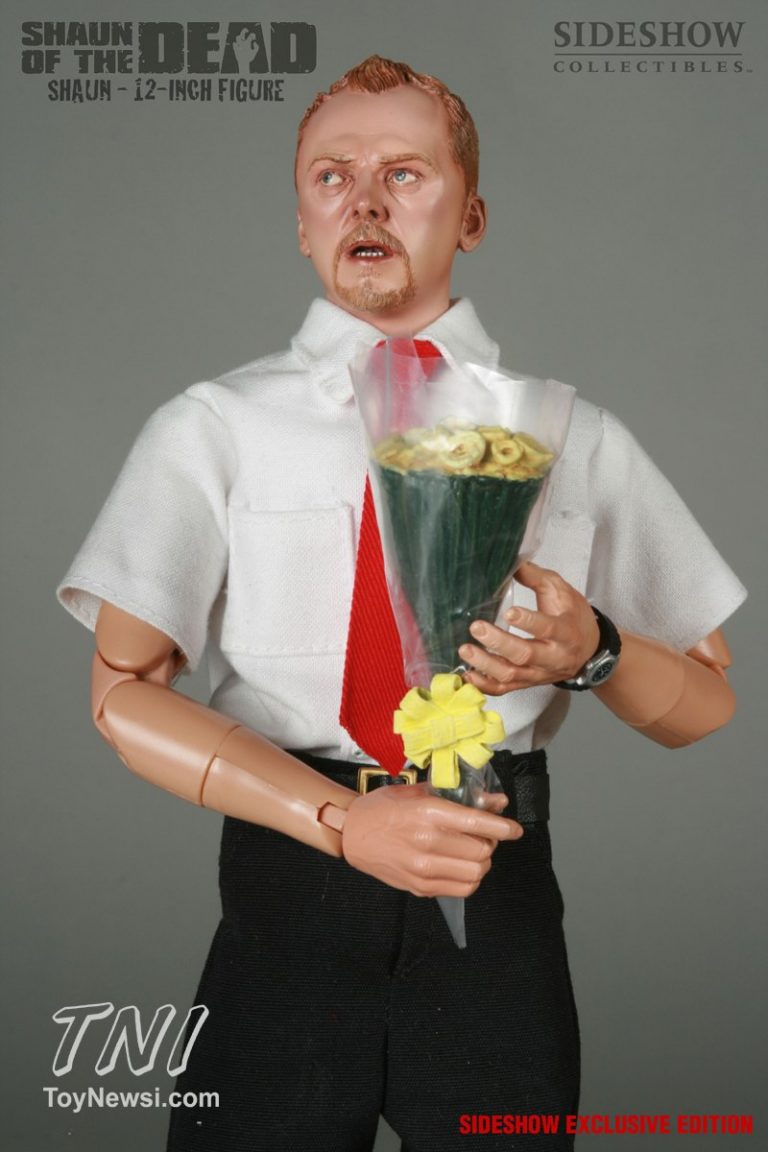 Shaun’s nametag, Two vinyl records with sleeves, Cricket Bat, Pool Cue, 2 sets of interchangeable hands, 12-Inch Figure Display Base with ‘Shaun of the Dead’ logo.