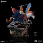 Covered by a battle helmet and a chest plate in shades of blue and pink, the majestic white winged unicorn trots over the world’s exuberant vegetation under its protection, opening its big colorful wings split into blue, pink, and orange feathers, ready to fly, the might stallion brings in its back, mounted in its saddle, the beautiful warrior known as the Princess of Power, that raises her magic sword to fight for her rebel allies, and all the people from Etheria, against the forces of an intergalactic oppressive regime commanded by Lord Hordak. Surprising fans and collectors during the San Diego Comic-Con 2023, Iron Studios presented in its booth the statue “She-Ra and Swift Wind Deluxe – Masters of the Universe – Art Scale 1/10” in one of the world’s most traditional pop culture events, with the hero protagonist of the spin-off show from Masters of the Universe produced in 1985 by Filmation.