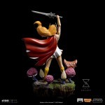 Between two beautiful specimens of Etheria’s lush vegetation at her feet, the pretty and majestic warrior raises her mighty sword to protect her allies and the oppressed people from her planet, against the forces of a tyrant conqueror and his followers. With a winged tiara on top of her long blond hair, wearing a white dress with metal prints, a red cape, golden boots, and long armbands that extend from her elbows to her wrists, she is known as the Princess of Power. By her side, a small, keen, and percipient winged creature, with broad yellow eyes, a purple beak, and a rainbow pattern on the inside of its ears that serve as wings, lands on one of the native plants observing and admiring its protector, friend, and ally. One of the most awaited and desired characters by fans and collectors finally gets her statue in Iron Studios’ collection, which proudly present “She-Ra Princess of Power BDS – Masters of the Universe – Art Scale 1/10”, next to her fun adventure companion Kowl over a diorama base decorated with details of the plains from the planet Etheria.