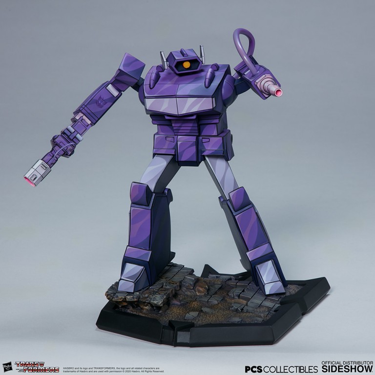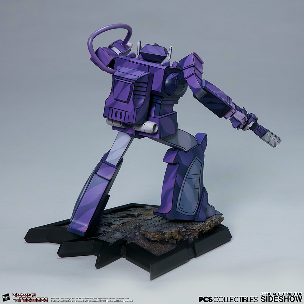 The Shockwave Classic Scale Statue measures just over 9” tall on a rubble-covered Decepticon logo base. This cold and calculating enemy of the Autobots aims his arm cannon, ready to defeat his emotion-driven enemies with logic and strategy.