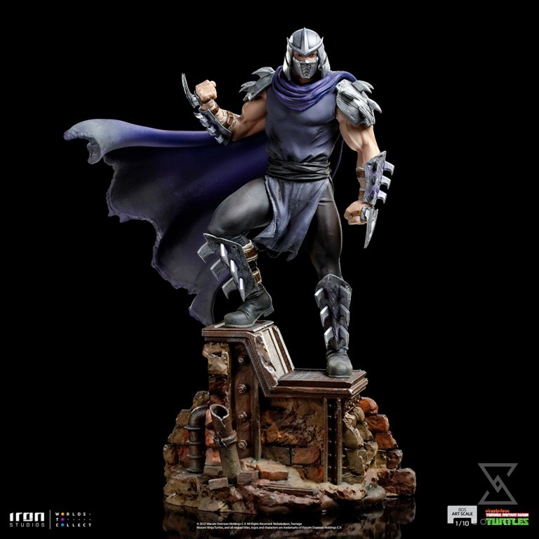In the shadows of New York City searching for his enemies, the shine of his sharp blades on metal plates composing an armor that covers part of his legs, arms, and shoulders, challenges anyone on its path. With cold and merciless eyes under a silver samurai helmet that hides his face, and wearing a black and gray tunic with a rustic cape, the main archenemy of the most famous turtle brothers on pop culture gets his statue “Shredder BDS – TMNT – Art Scale 1/10” by Iron Studios, presenting the fearsome leader of the criminal ninja group Foot Clan, over a diorama pedestal formed by beams and rusted pipes of an old brick wall, referring to the worn-out scenery of NY sewers.