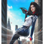 The sun shines brightly above New York City, and the Spider-Heroes have come out to play! In her sleek black, white, and red costume, Cindy Moon lounges casually on a large white web. She threads her fingers through her voluminous black hair as her attention drifts back toward tall buildings. While she basks in warmth and light, Spider-Man swings across fluffy white clouds, ready to join his friend and ally on this tranquil day.