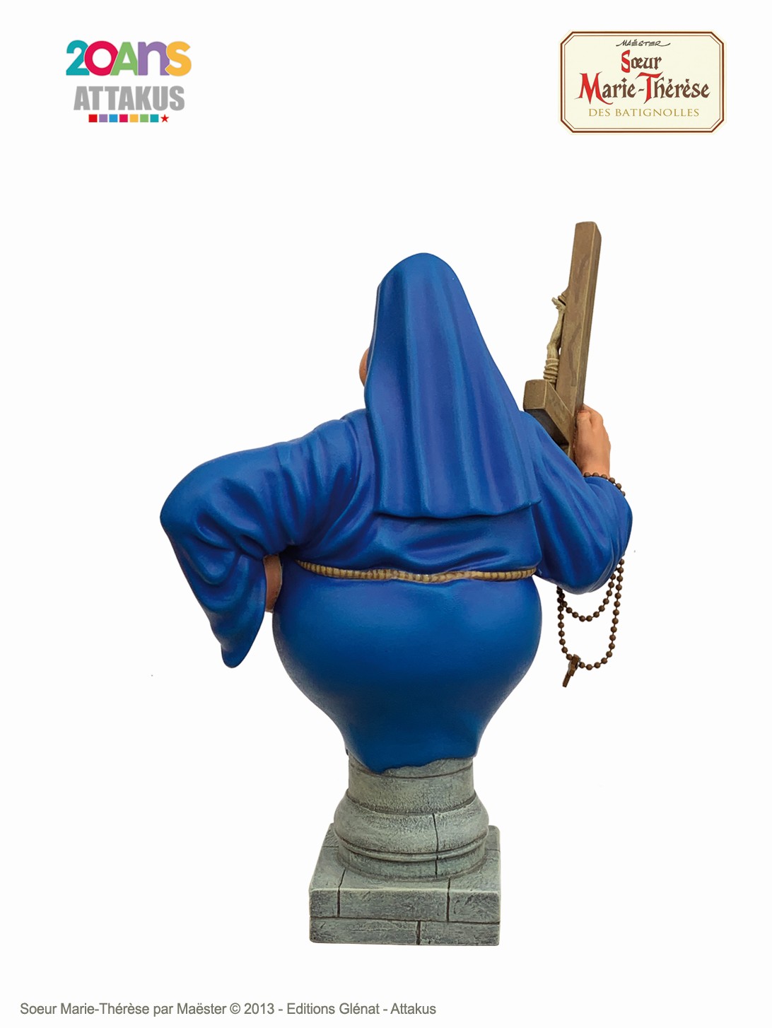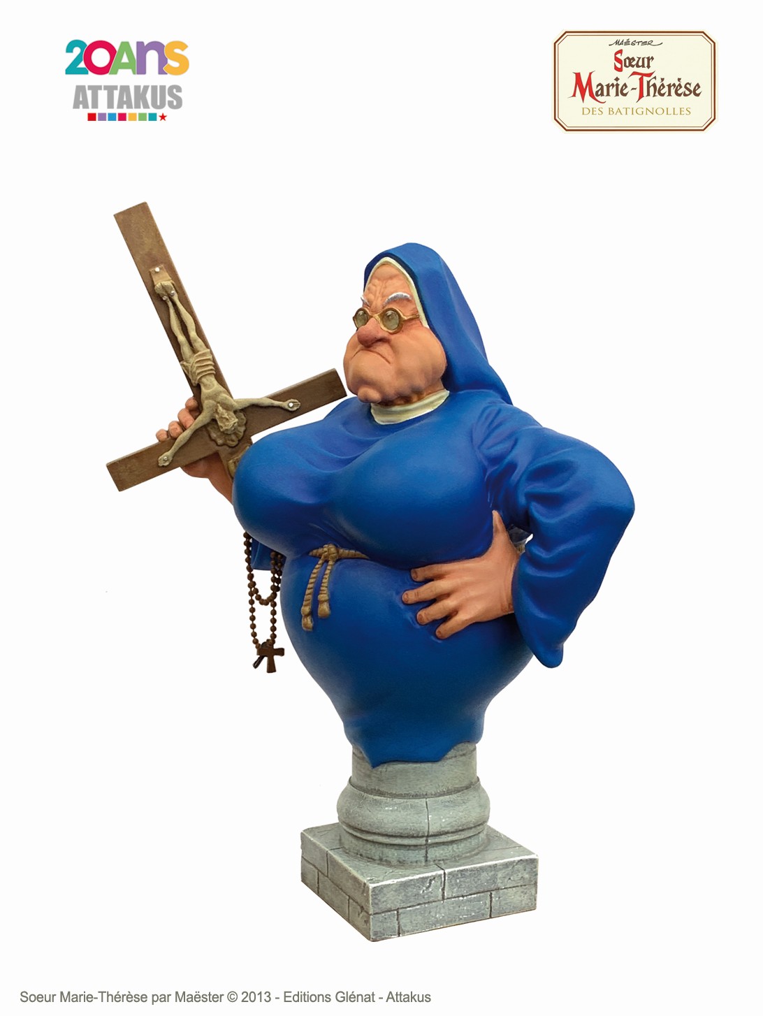 To celebrate the publication of “Ainsi soit elle”, volume 7 of Sister Marie-Therese of the Batignolles, Attakus has the pleasure and the honor to present to you, for the first time of all time, the favorite character of the master Maëster in 3D. And what 3D! The emblematic nun, with her strong character and opulent forms, is here armed with her crucifix, ready to fight. Enjoy the expressiveness of his face (really not convenient), the attention to detail and very faithful to the original drawing. Here is a statue that will not go unnoticed! A simple look at this funny cartoon and the rest of your day is illuminate.