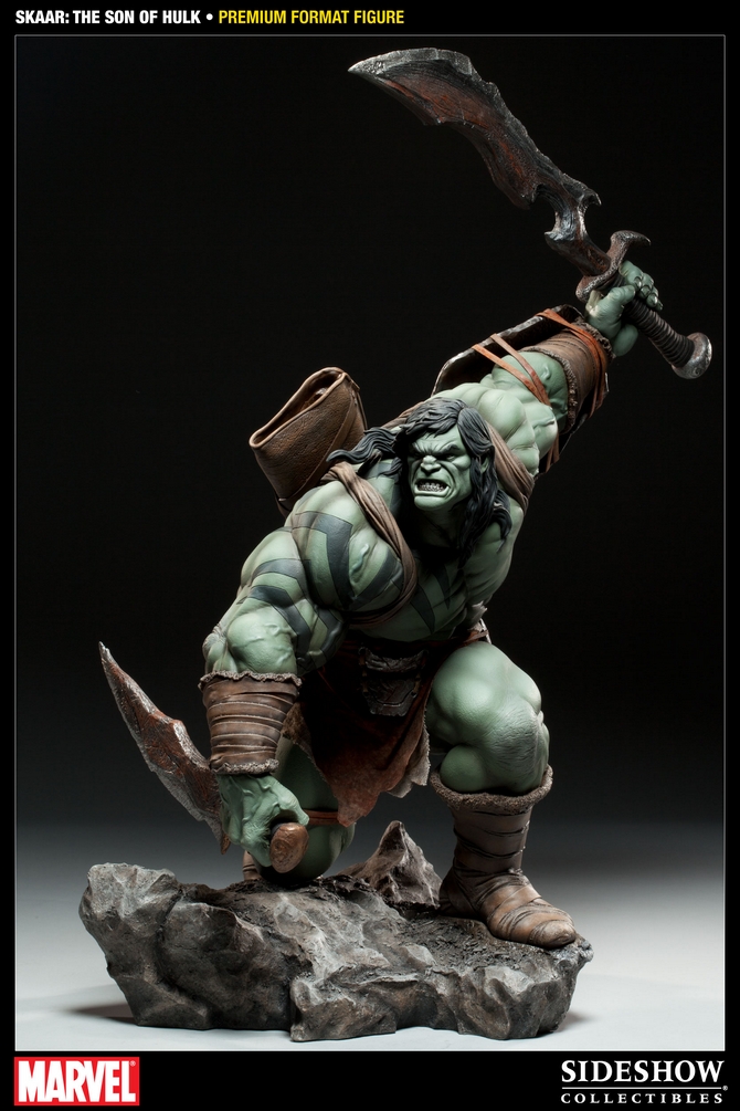 The latest to join Sideshow’s cast of Marvel Premium Format Figures is Skaar, Son of Hulk. Each piece is individually painted and finished, each with its own unique quality and detail that is the trademark of a handcrafted Sideshow Collectibles product. Featuring a real fabric costume and presenting the Sakaarson in 1:4 scale, the Skaar Premium Format Figure is an outstanding addition to any collection.