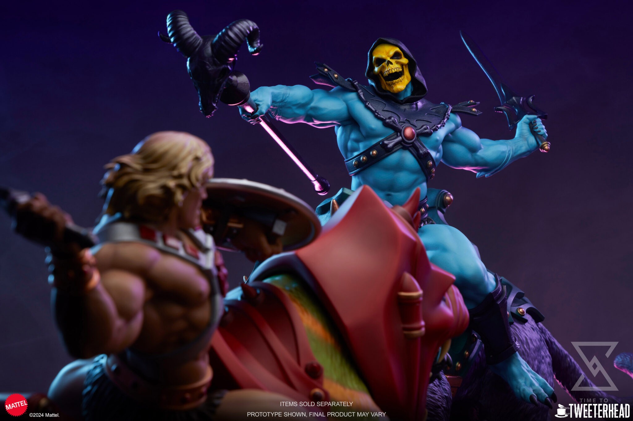 This fully sculpted polyresin maquette comes with Skeletor sitting atop a saddled Panthor, leaping off of Castle Grayskull’s iconic skeletal ramp lunging into battle! This duo are sculpted with intricate details that pay homage to all the vintage and classic interpretations of the pair giving fans the definitive Skeletor & Panthor maquette they have been waiting for, which pairs perfectly with the He-Man & Battle Cat maquette!