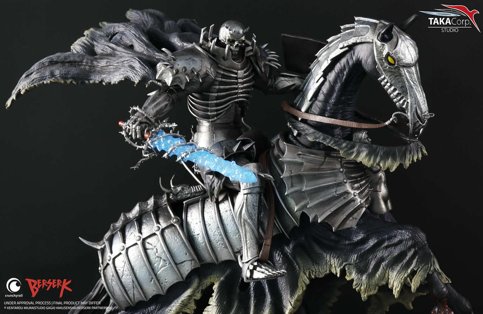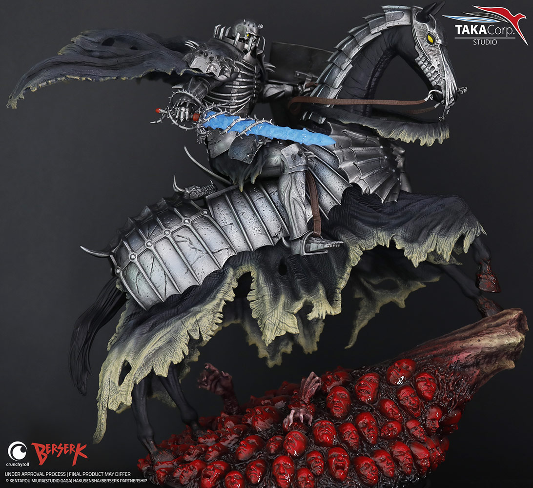 Taka Corp Studio decided to represent the mysterious skeleton knight during the eclipse scene, arriving at the last minute in order to rescue Guts and Casca from Griffith and his God hands.